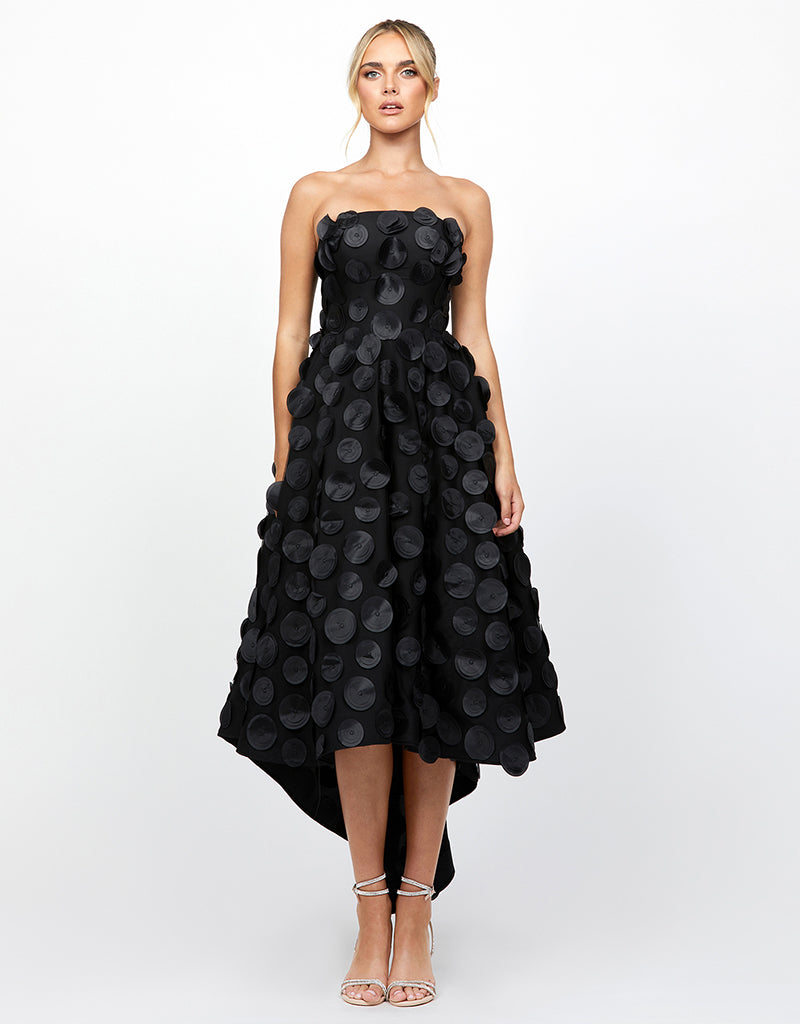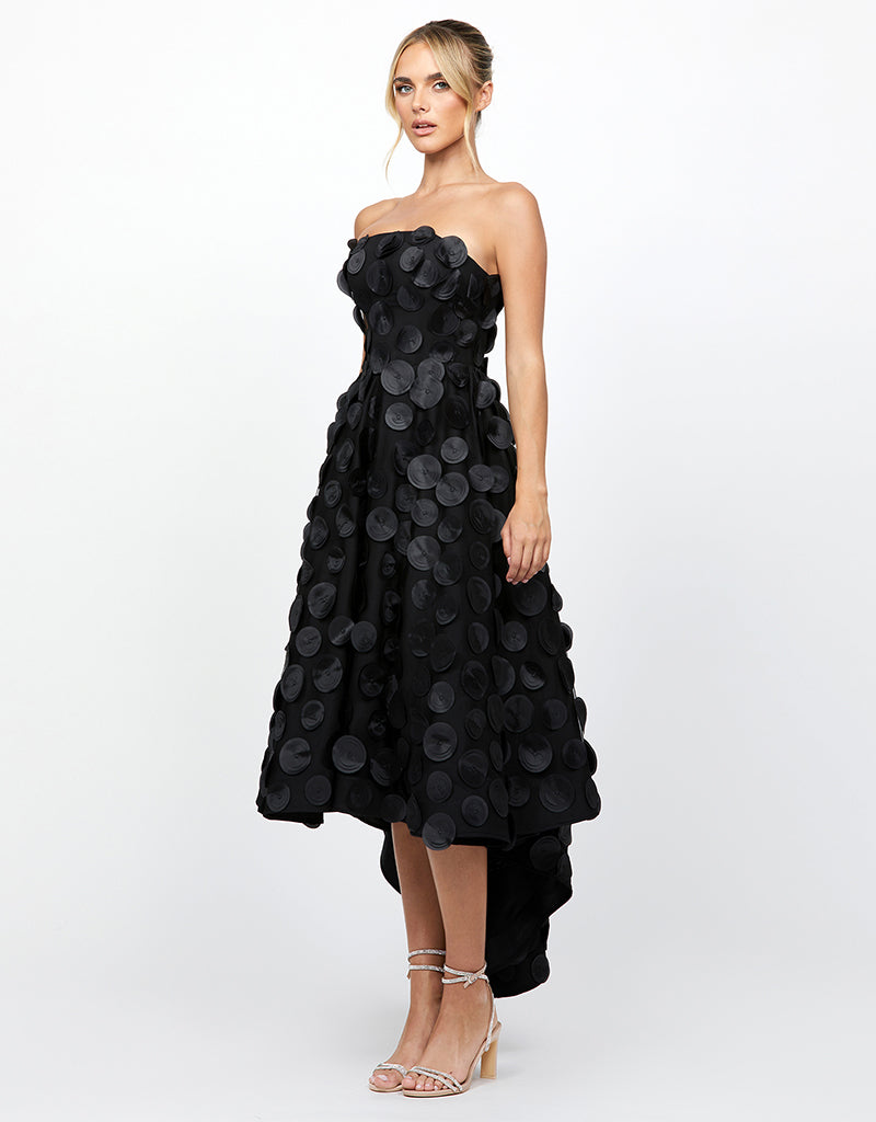 Delicate detail meets modern drama in this standout strapless gown. Featuring a clean, straight-across neckline and a structured boned bodice with built-in cups, this silhouette is designed to support and flatter. The A-line skirt adds volume and movement, finished with a striking hi-lo hemline that showcases your shoes with flair. Crafted from intricate laser cut 3D circle fabric, this dress offers a unique texture and a truly elevated finish. Fully lined and complete with an invisible back zip, it's the perfect choice for fashion-forward formal events, weddings, or special occasions.