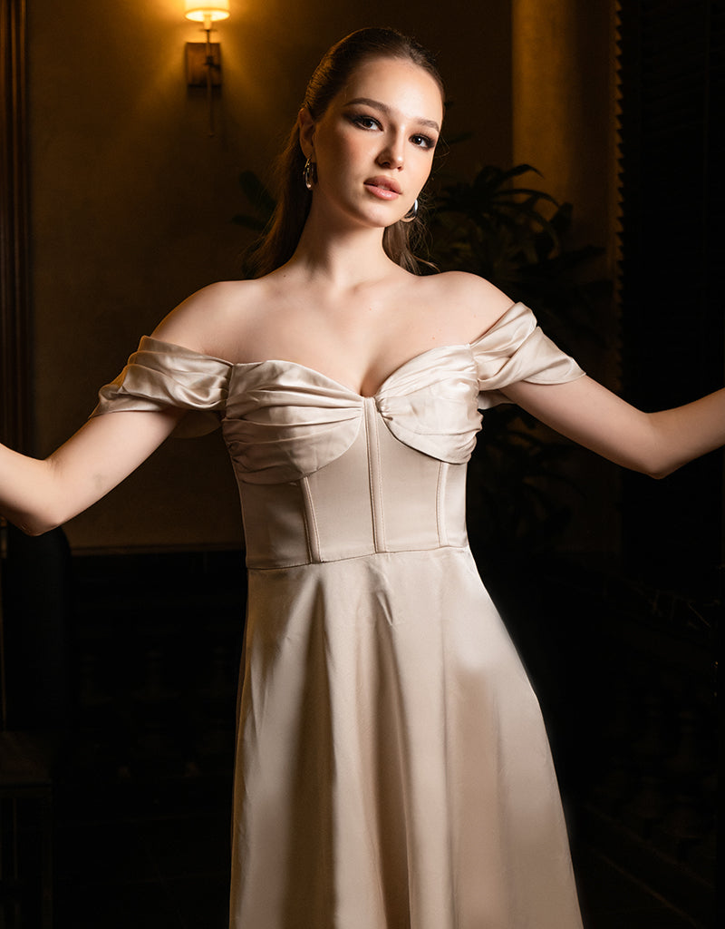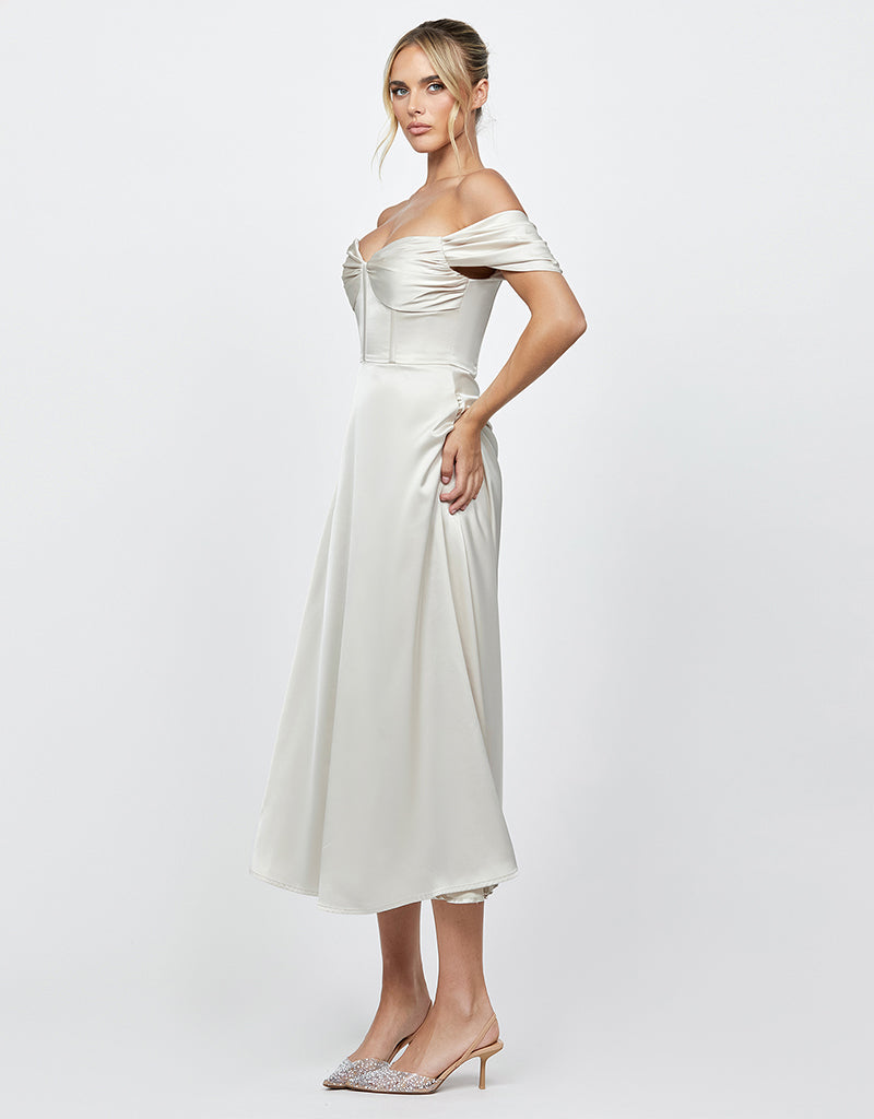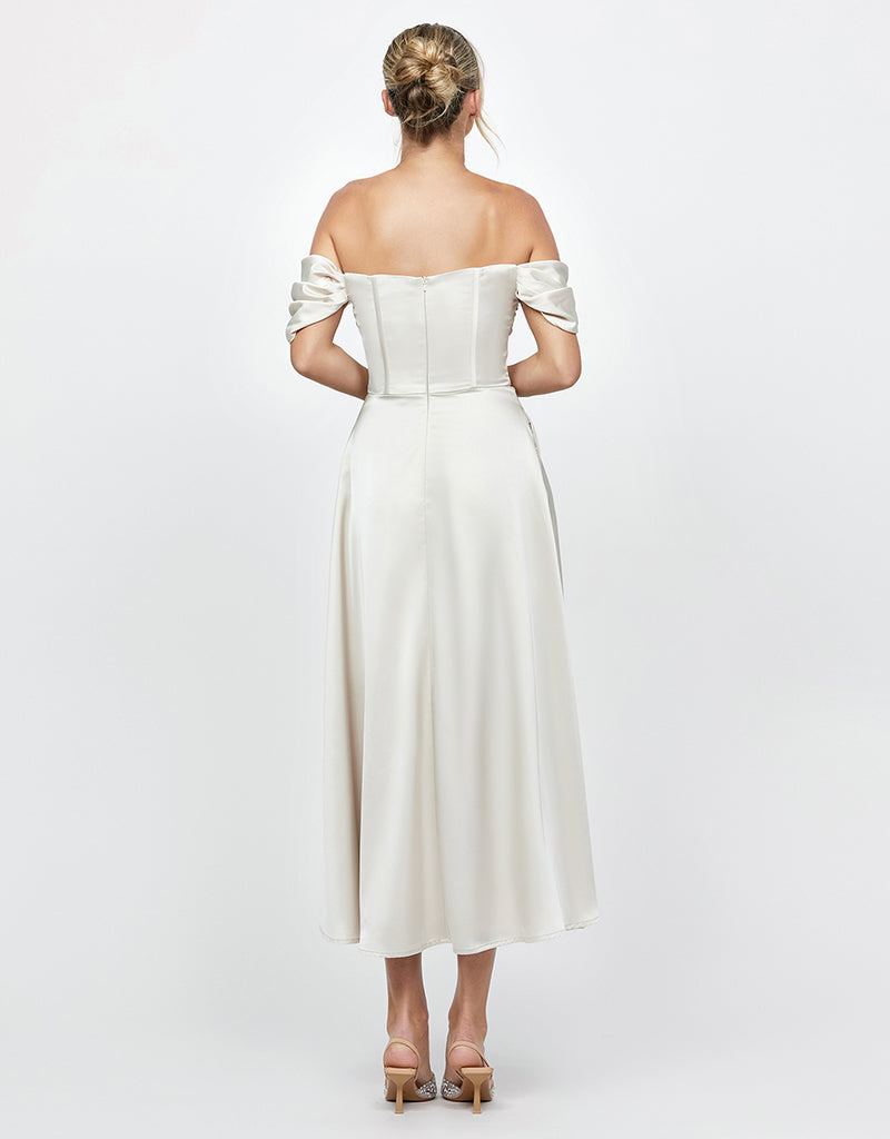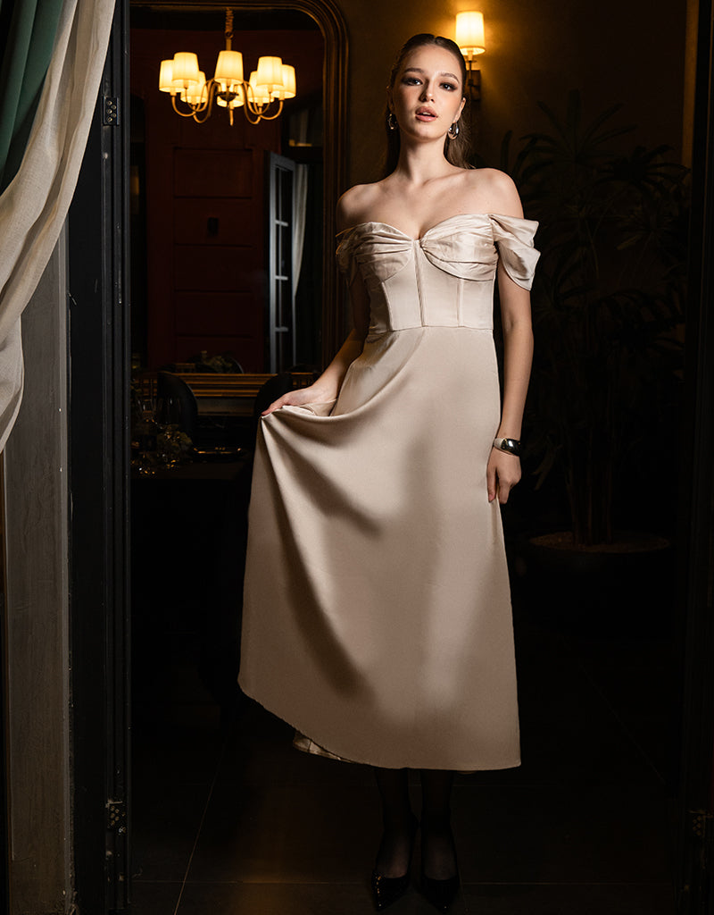 The ultimate choice for anyone who desire a blend of classic elegance and modern sophistication. This luxurious satin dress features a sweetheart off-shoulder neckline with a pleated bust, paired with a boned bodice and draped sleeves for a flattering and supportive fit. The midi-length A-line skirt flows gracefully and is complete with hidden side pockets, adding both style and practicality. Fully lined for comfort, this dress is finished with an invisible zip closure at the back, ensuring a seamless and flawless appearance.