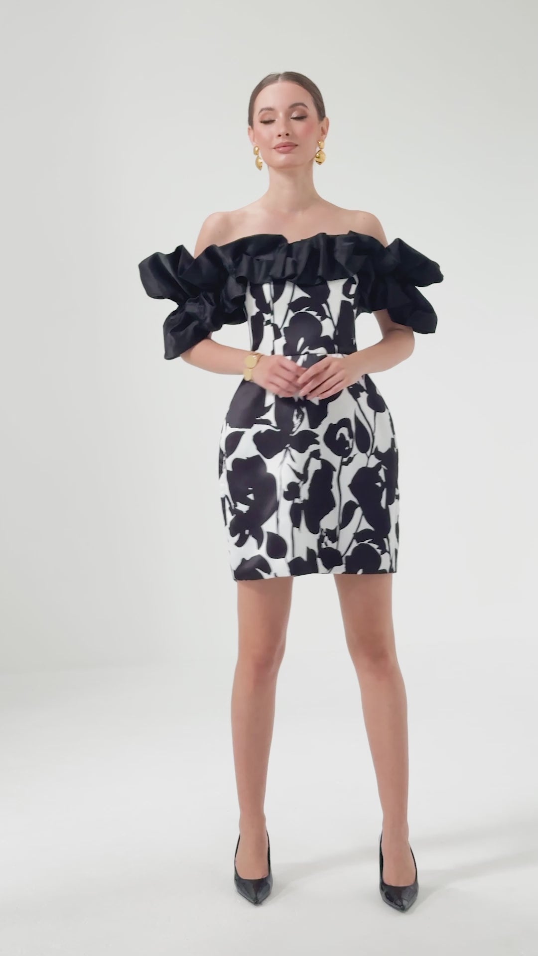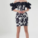 Cut with an off-shoulder neckline, this dress is defined by a voluminous bubble ruffle that frames the décolletage. The fitted bodice is shaped with paneled seams before falling to a bell-shaped mini skirt. Fully lined and finished with an invisible back zip for a clean close.