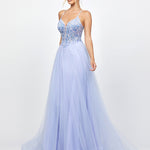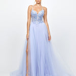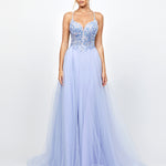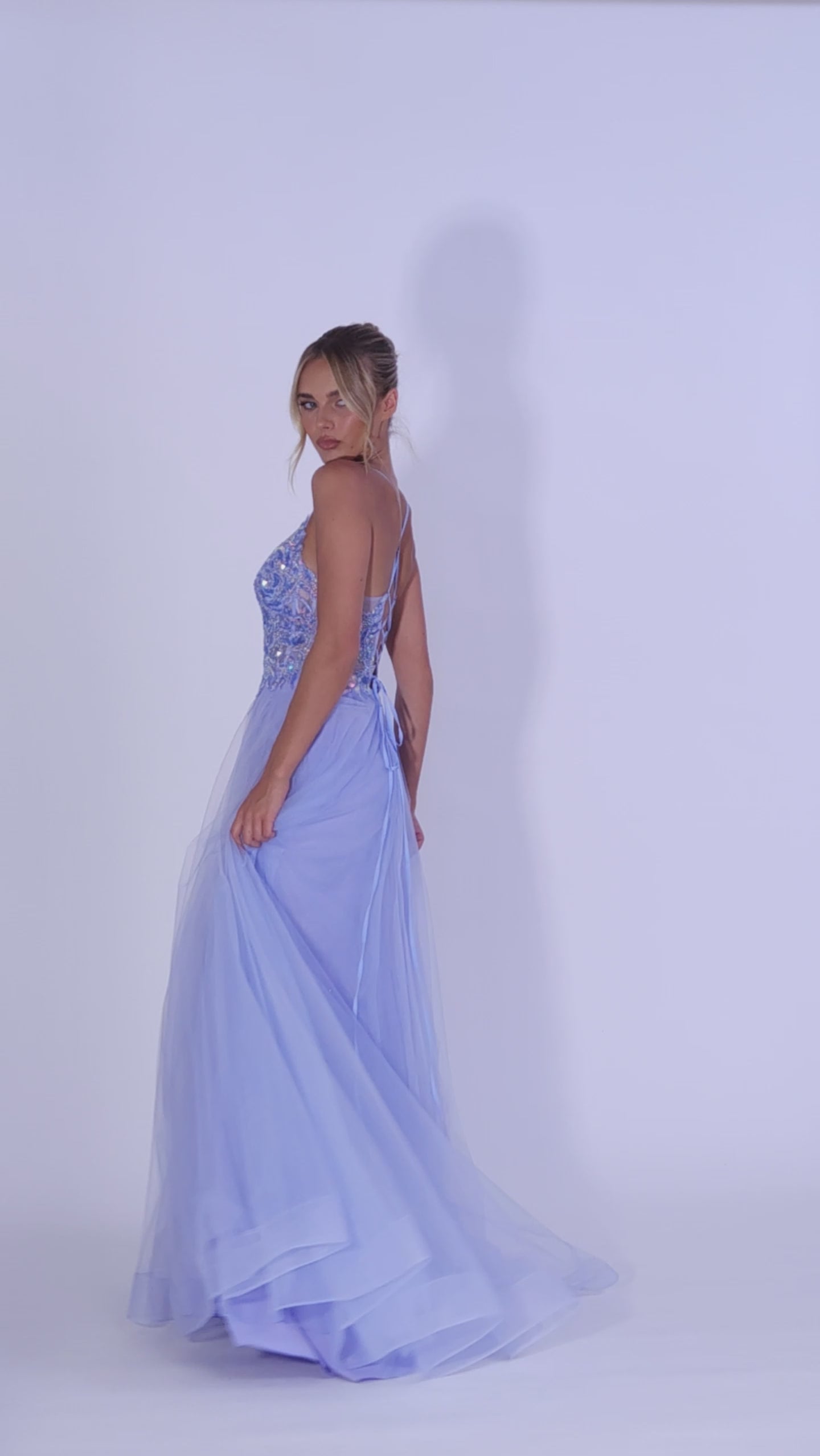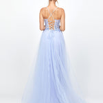 Elevate your style with this stunning tulle and lace dress, featuring a partially sheer bodice adorned with delicate lace appliqué and a modesty mesh insert for a hint of allure. The bodice is expertly structured with built-in bust cups and an eye-catching open strappy back that adds a modern twist. The flowing A-line skirt includes a crinoline hemline for added volume, a side slit for effortless movement, and a graceful back skirt detail. Fully lined with an invisible back zip closure, this dress perfectly balances romantic elegance and contemporary design—ideal for weddings, formal events, or special occasions.