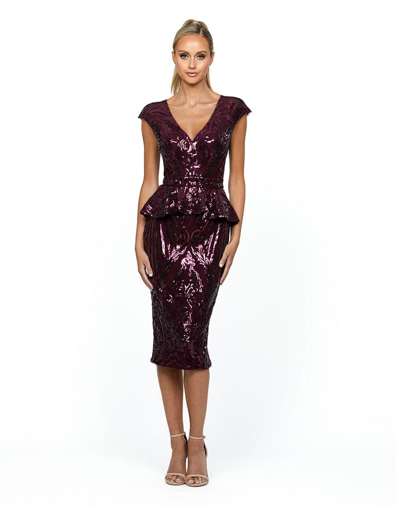 Never give a cold shoulder in the Venus. Capped sleeve with an overlay skirting at the waist adds to the drama of the luxe- sequin pattern dress. Pair with a simple nude or gold heel to maintain the neutral tones.