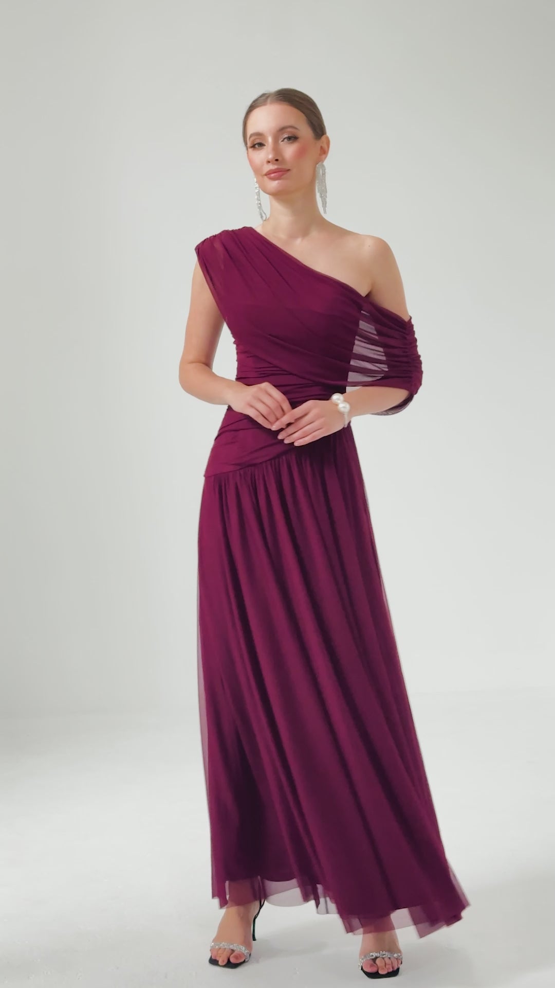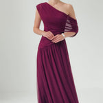 One-shoulder neckline with ruched draping across bodice
