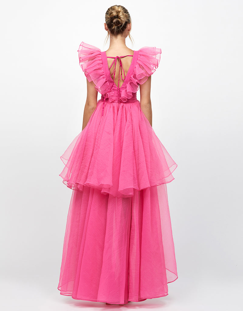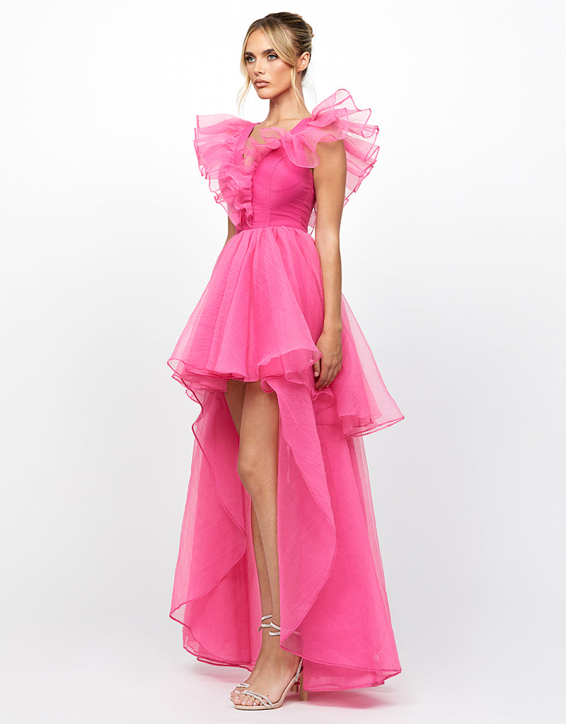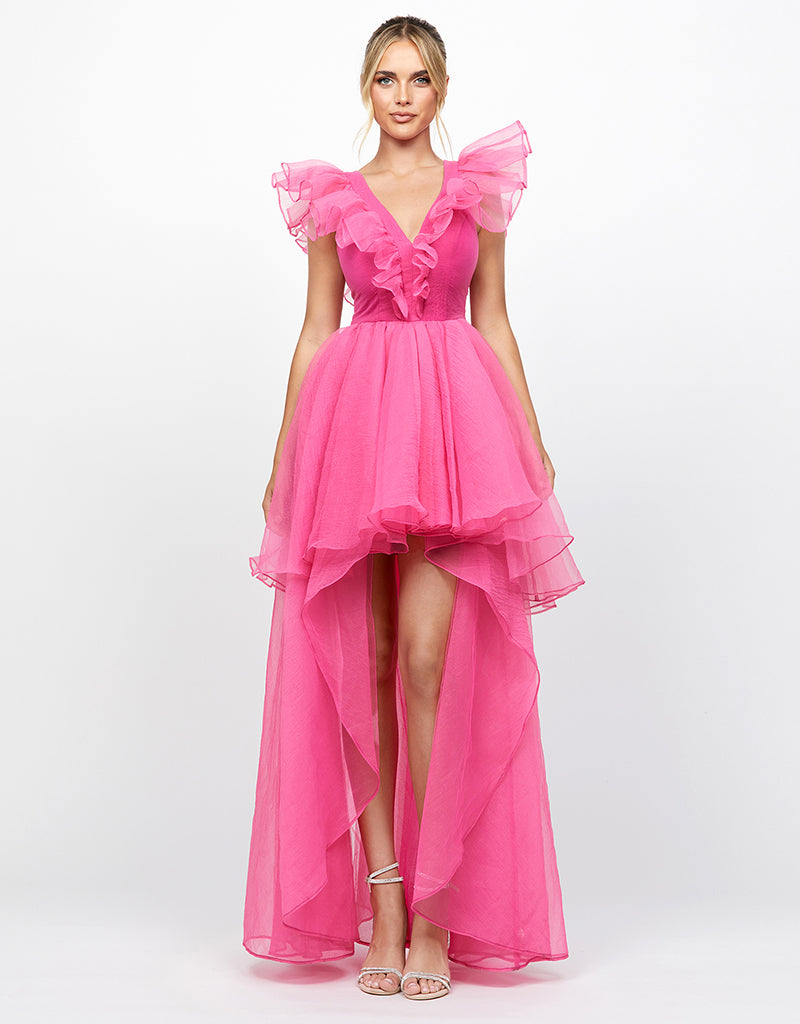 MARINA V NECK RUFFLE HI LO GOWN B79D23L
