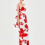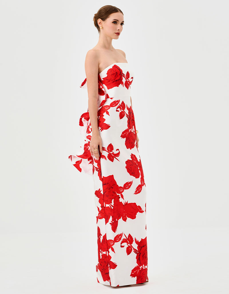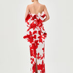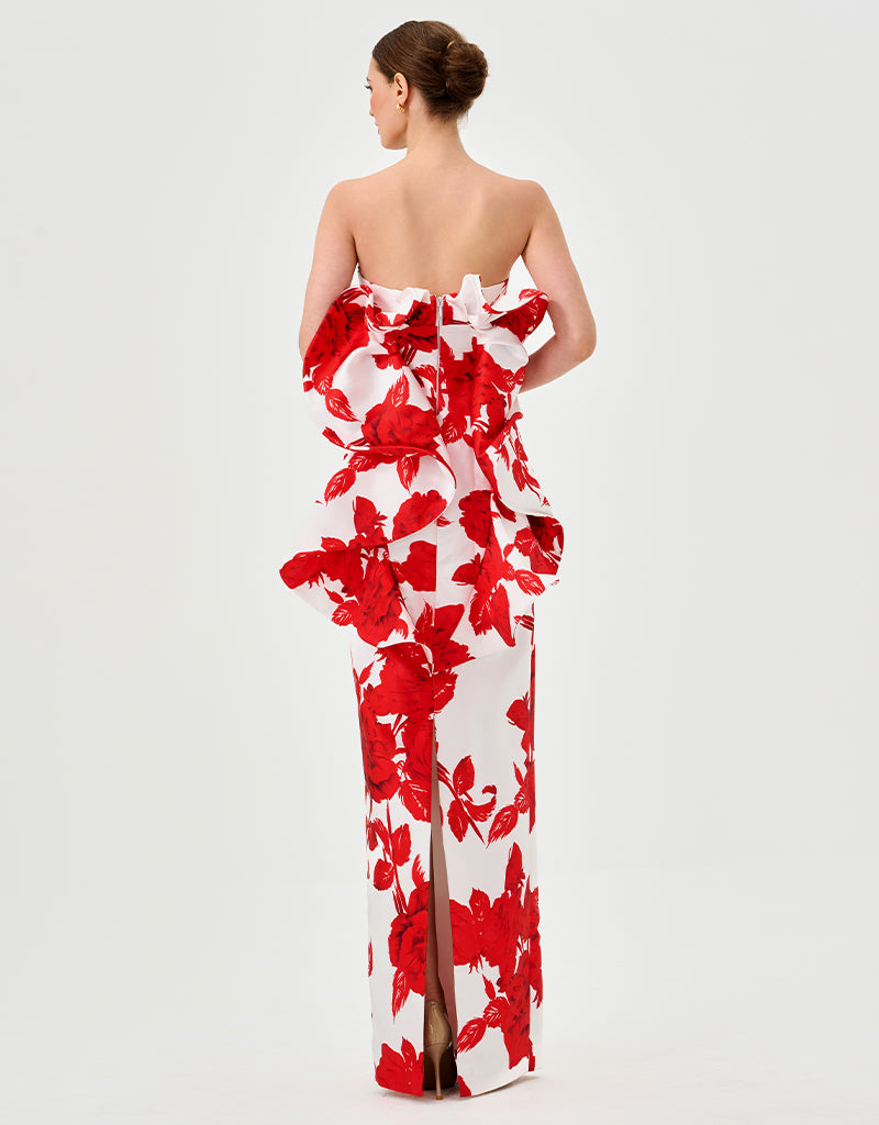Elevate your evening with a strapless gown featuring built-in cups, a fitted tapered waist, and a dramatic cascading double ruffle at the back, flowing into a full-length column skirt with a subtle back split and invisible zip closure.