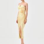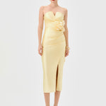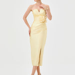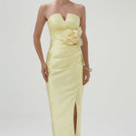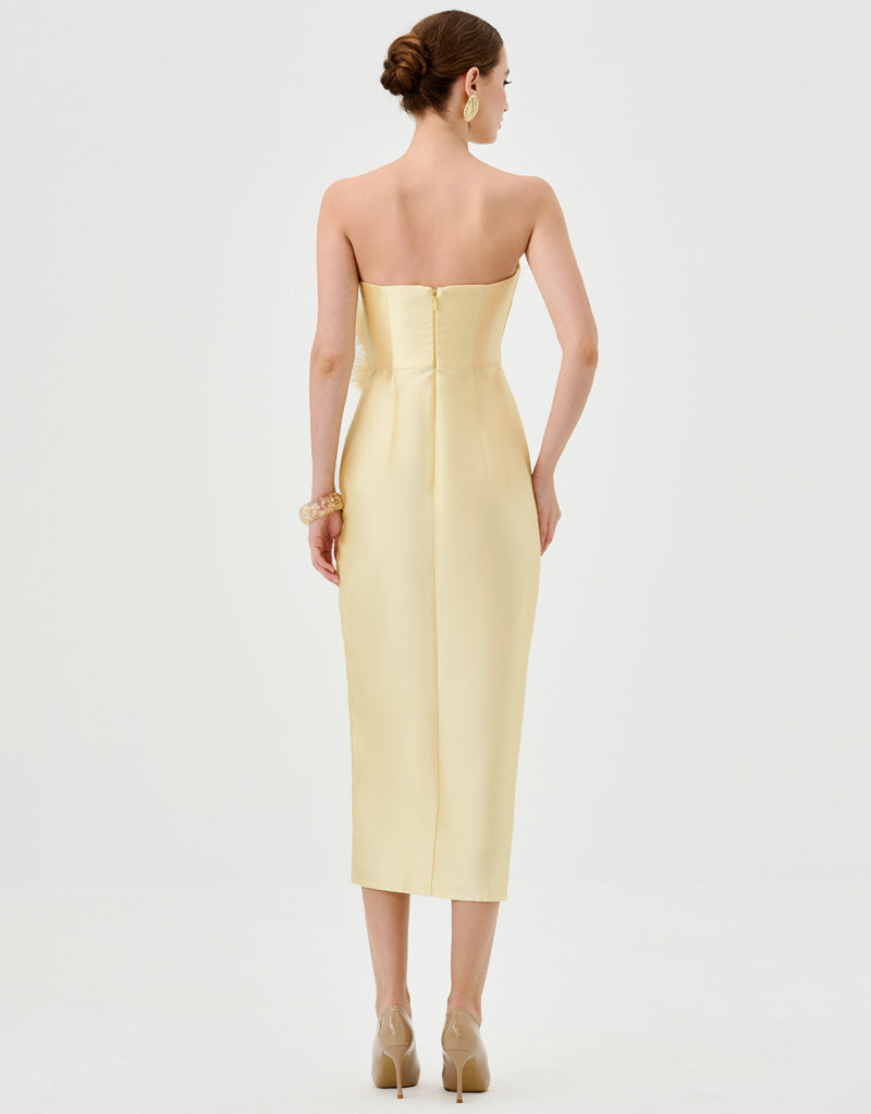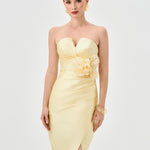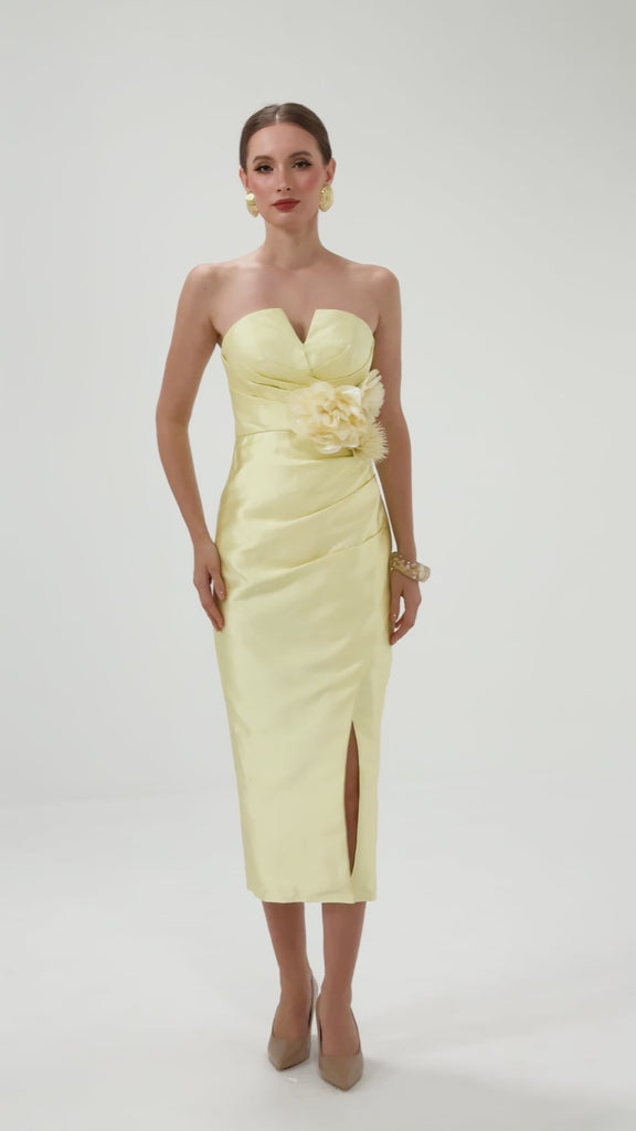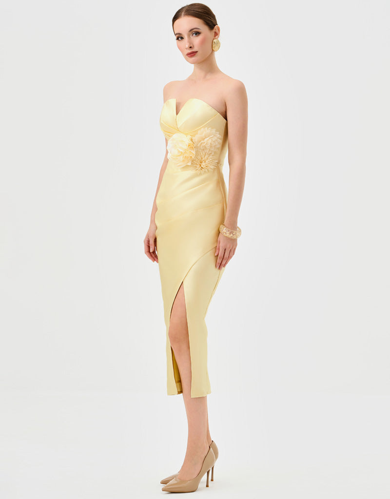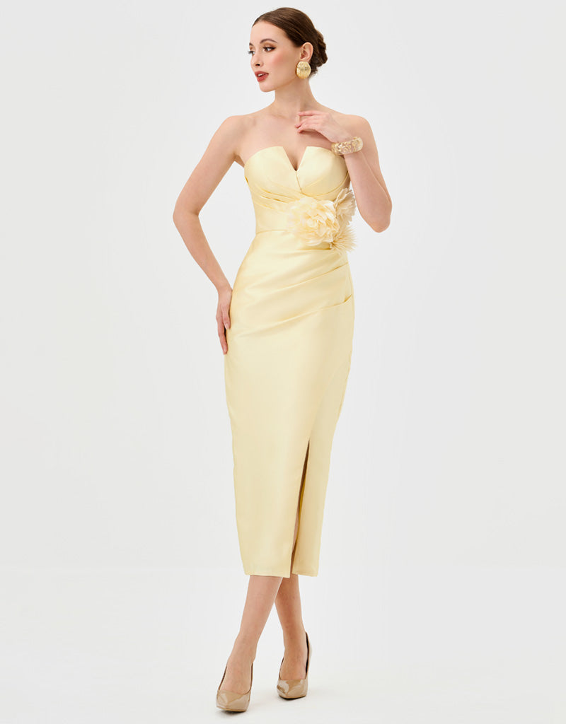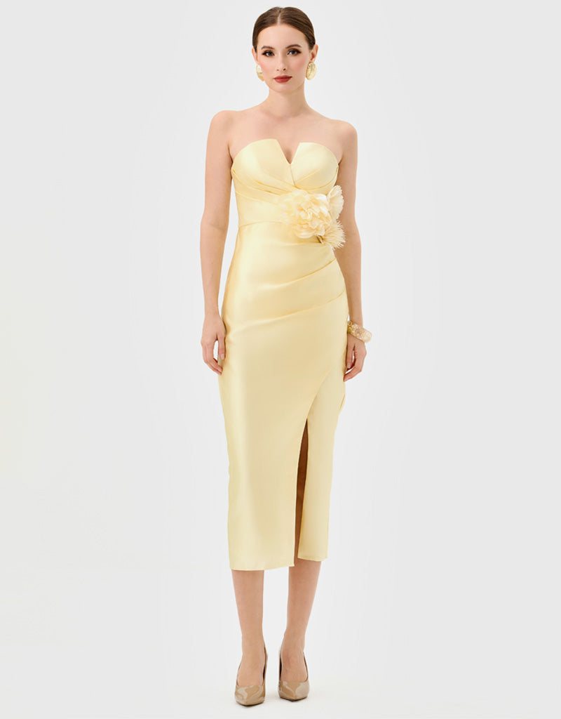 This strapless design features a sweetheart neckline with a ruched bodice for a sculpted effect. The waist is defined with a detachable floral appliqué and side tucks that enhance the silhouette. A crossover midi-length skirt is finished with a front split for ease of movement. Fully lined and secured with an invisible zip at the back.