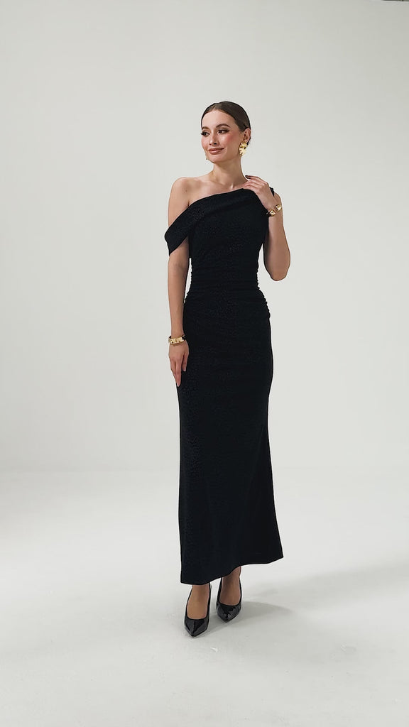 This gown is cut with an asymmetrical one-shoulder neckline, balanced by a ruched bodice that enhances its fitted silhouette. The design is detailed with ruching through the waist and hips before falling to a floor-length skirt with a subtle flared hem. Fully lined and finished with an invisible zip closure at the back.