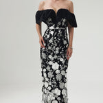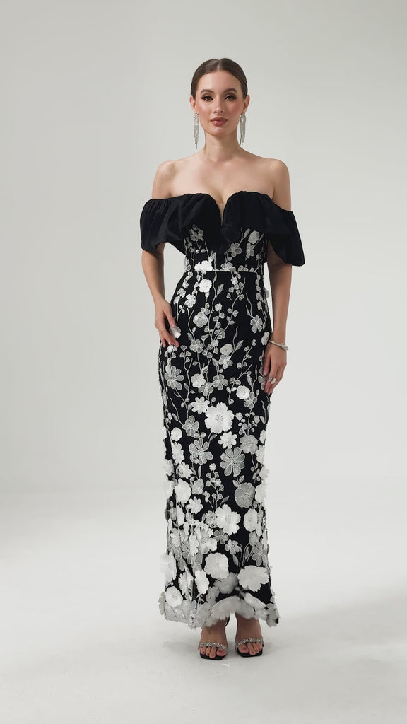 This gown is designed with an off-the-shoulder sweetheart neckline framed by a ruffled taffeta trim. The fitted bodice tapers into the waist before falling to a sleek full-length column skirt, finished with a back split for ease of movement. Fully lined and secured with an invisible back zip for a clean close.