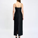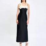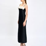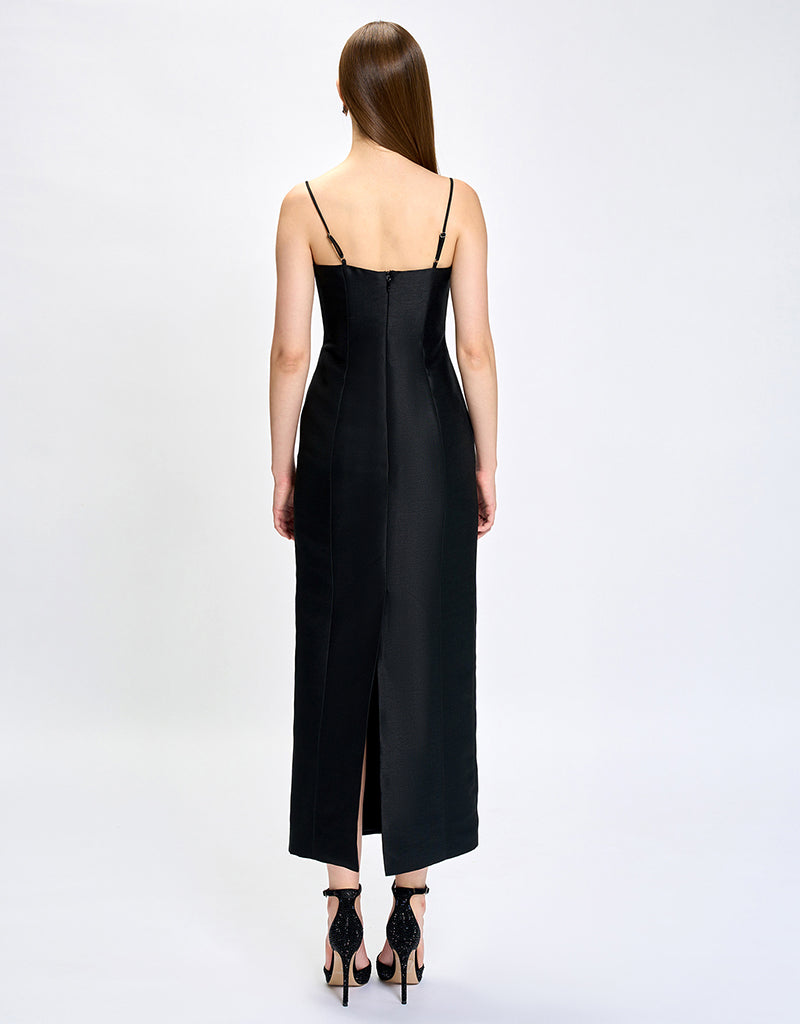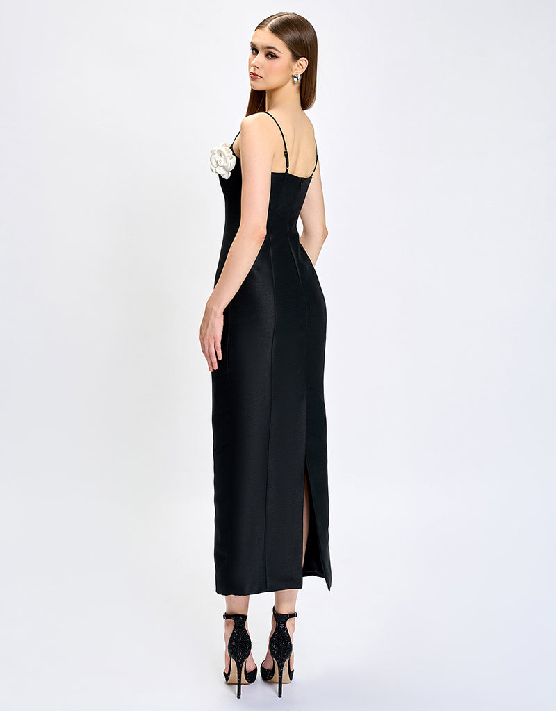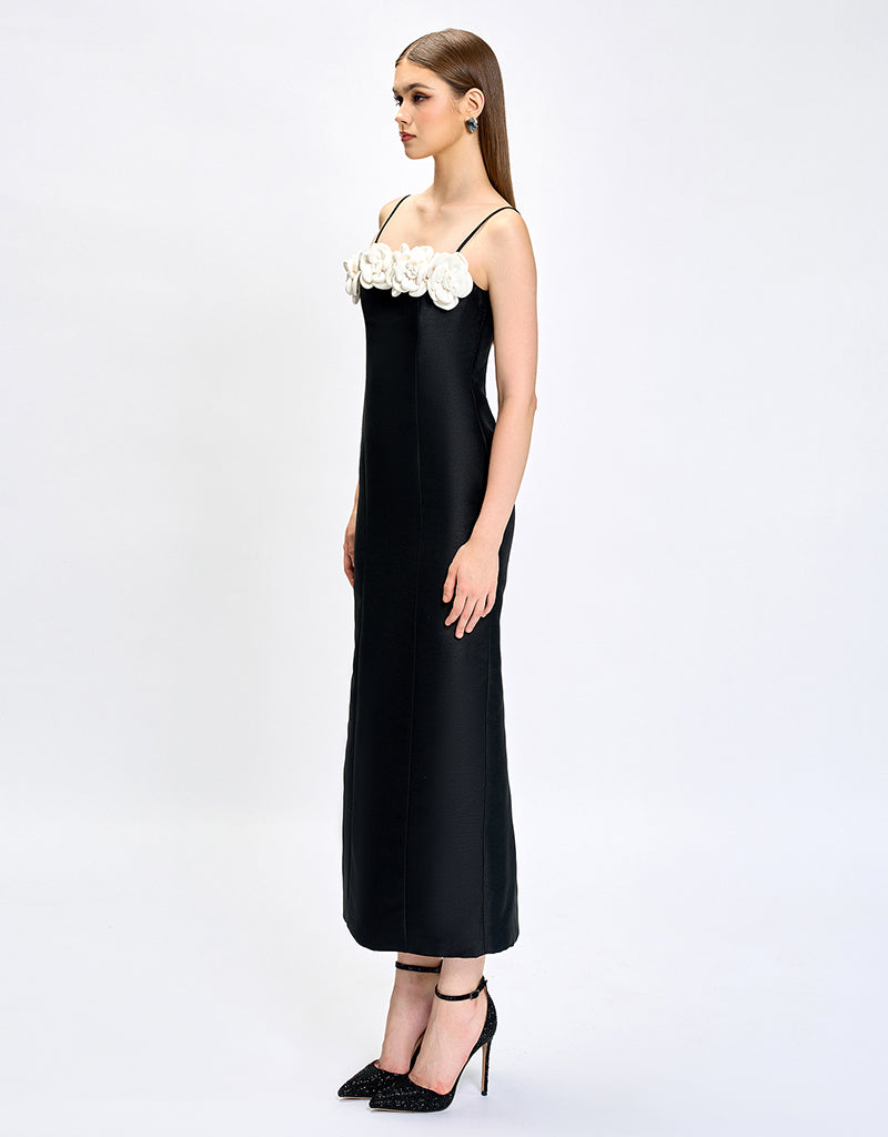 Elegant and refined, this midaxi dress is crafted from luxe thick satin for a smooth, structured finish. Featuring a straight-across neckline adorned with delicate floral appliqué and adjustable spaghetti straps, the bodice offers a soft romantic touch with a tailored fit. The sleek column silhouette falls to a midaxi length and includes a subtle back split for ease of movement. Fully lined and finished with an invisible back zip closure, this timeless piece is perfect for weddings, special occasions, or elevated evening events.