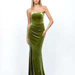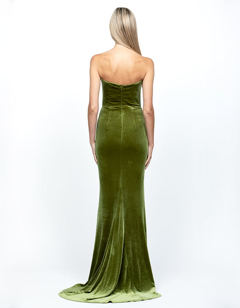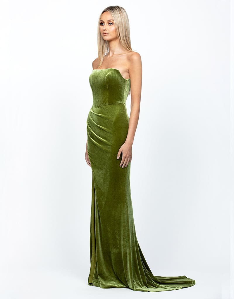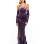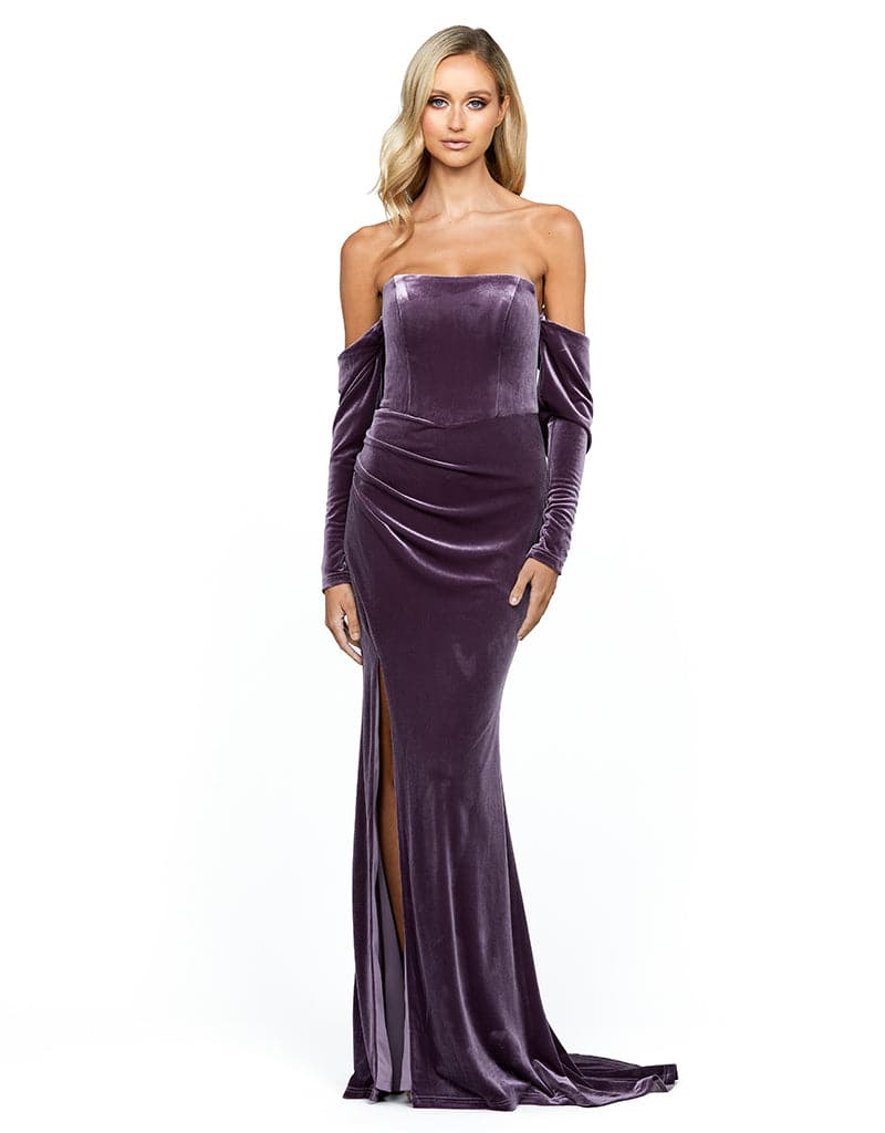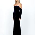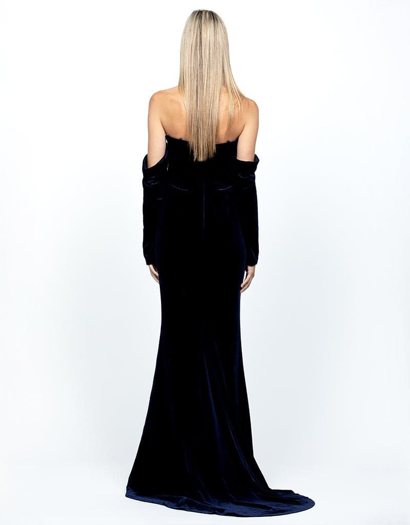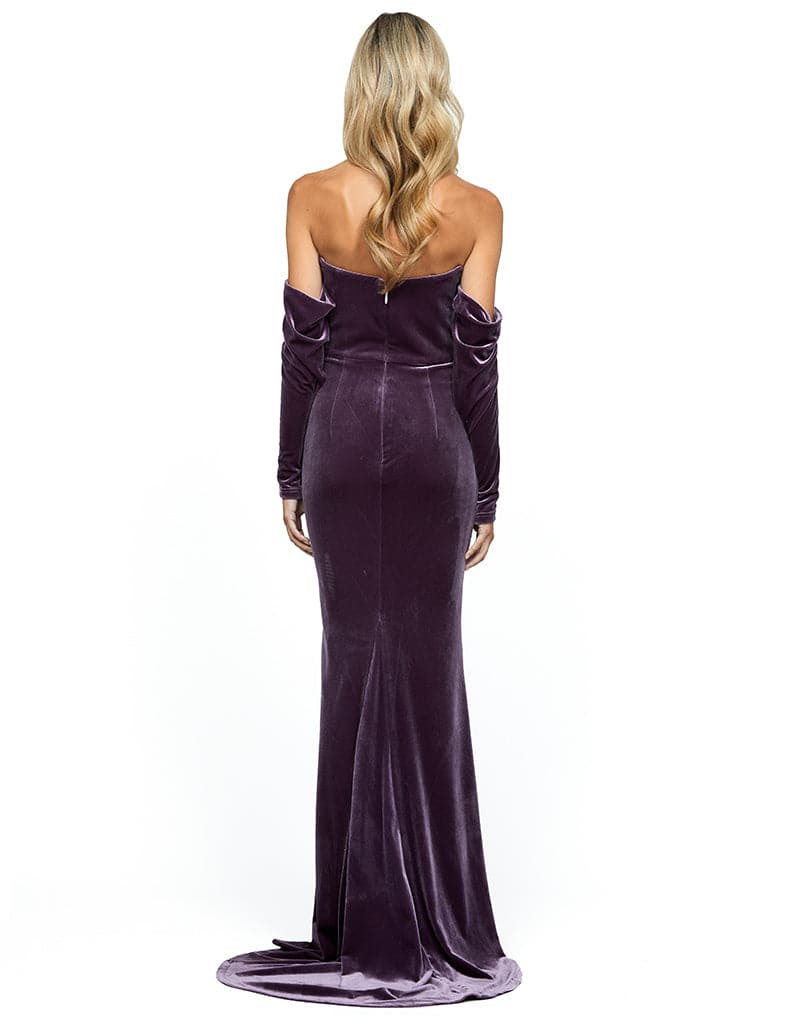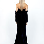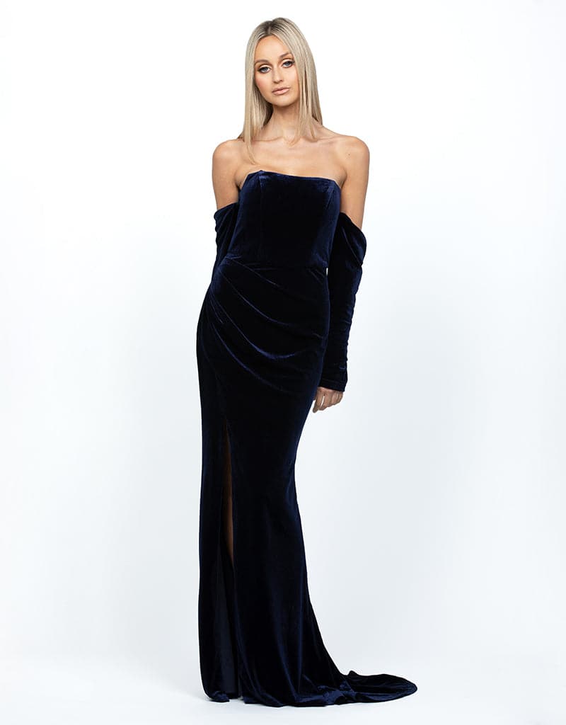 You'll feel draped to perfection in the CASEY. The CASEY will take you from occasion to occasion with removable sleeves that allows you change up your look. Draped bodice, front side split and off shoulder sleeves will have you showing off your silhouette and some sultry skin, even in the cooler months. Pair with a neutral heel to allow the luxe-velvet fabric take credit for your ultimate outfit.