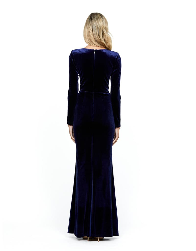 Discover your Goddess energy in the MARIHAN. The draped bodice, full-length skirt, long sleeves and front side split will hug you in all the right places, for any body type. The MARIHAN is draped in a luxe-velvet material, and you will never regret the touch of velvet. Pair with a simple heel to allow the dress to shine or style with a statement heel for an extra level of glamour.