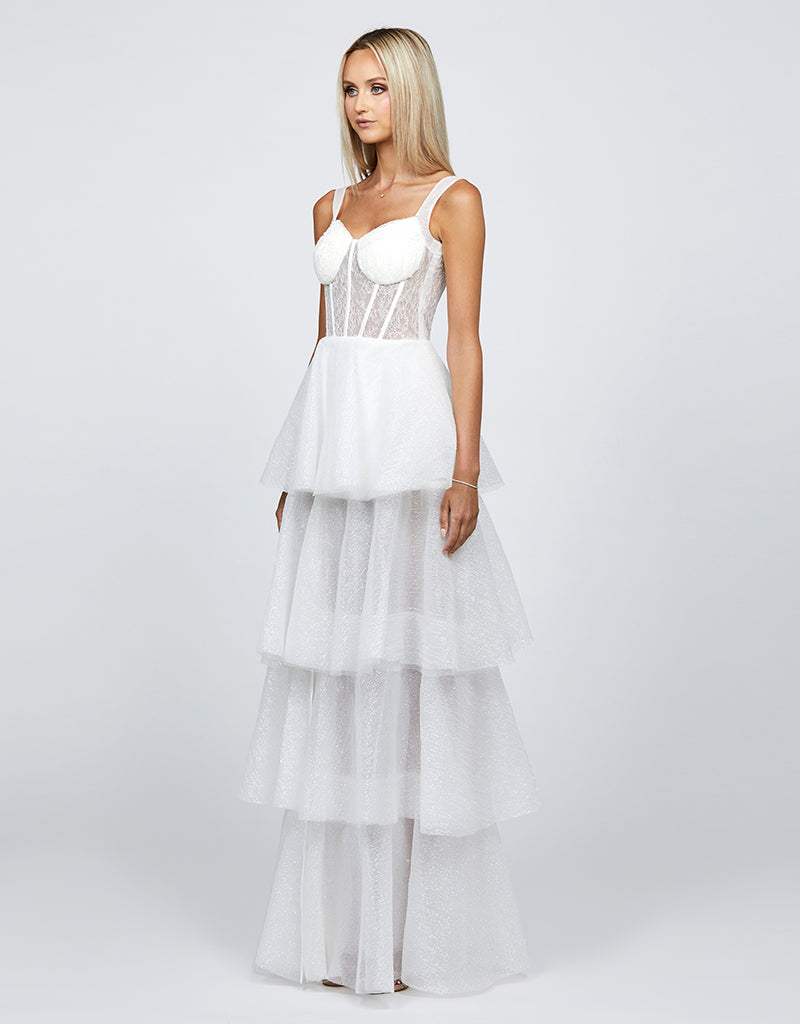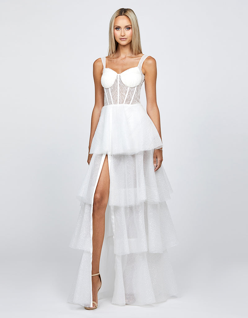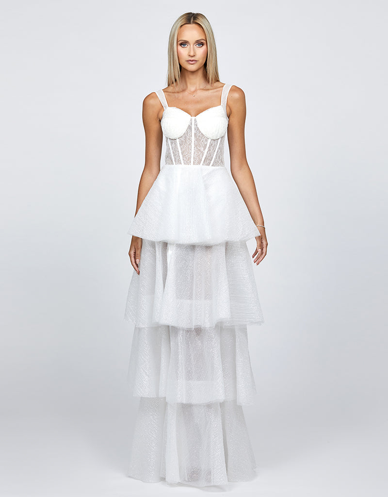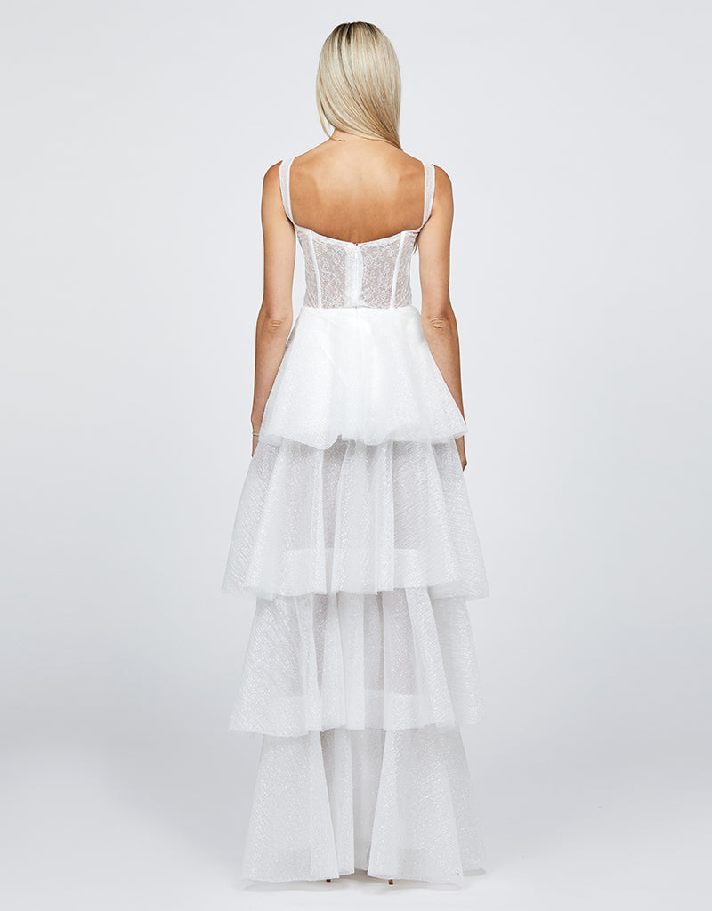 Prepare to dazzle in our ELVYRA CRYSTAL ORGANZA TIERED GOWN. Featuring multi-tiered ballgown skirt, and a high front split for a hint of drama. Crafted with exquisite texture from crystal organza and delicate chantilly lace, this dress embodies grace and beauty with every movement. Whether you're walking down the aisle or gracing a formal event, this dress promises to make you feel like royalty. Embrace your moment in the spotlight with this enchanting ensemble tailored for unforgettable memories.