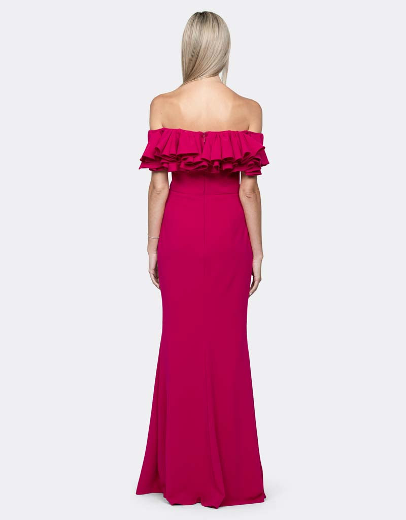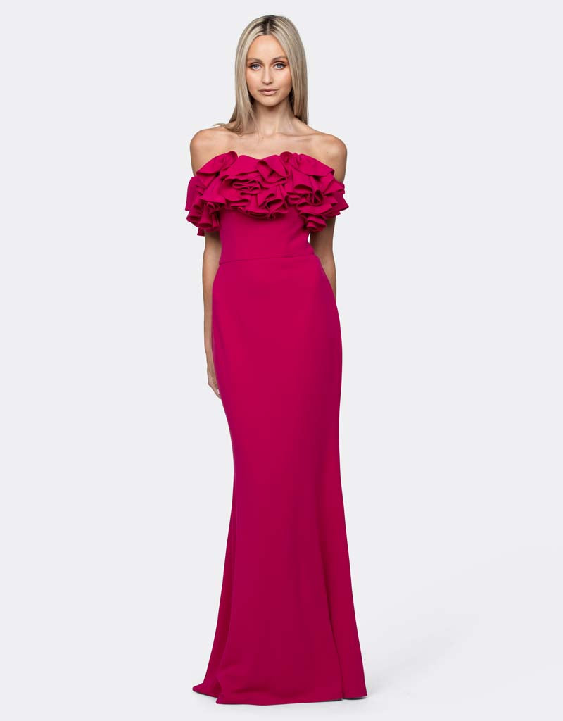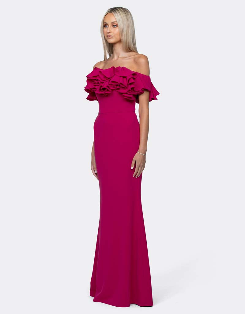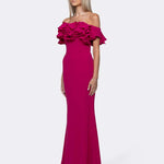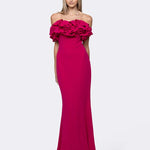 WAVERLY OFF SHOULDER RUFFLE GOWN SAMPLE B64D12L