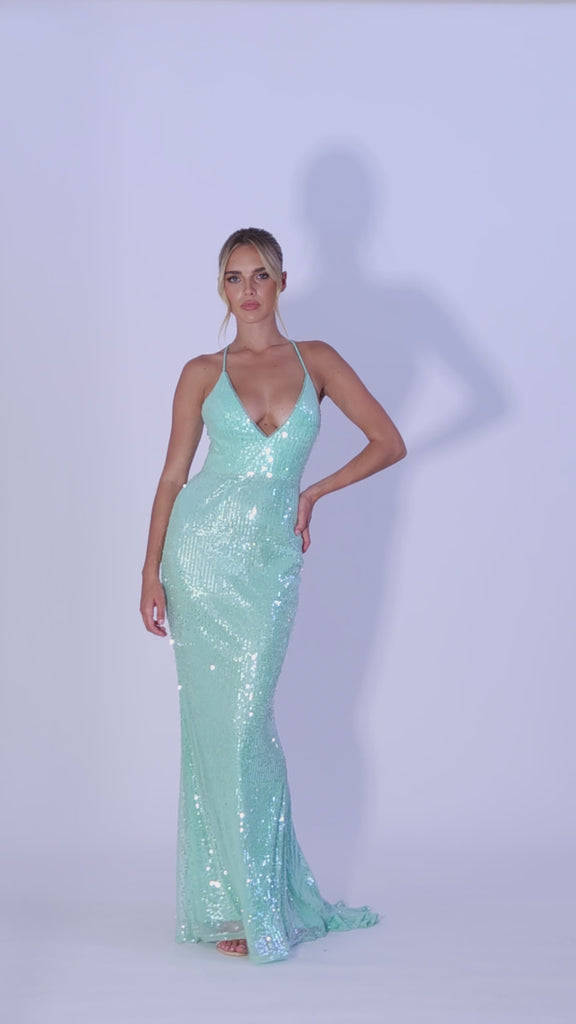 Shimmer and shine in this stunning sequin gown, designed to make a glamorous statement. Featuring a sweetheart V neckline with delicate spaghetti straps, the fitted bodice is enhanced by a dramatic low open back with an elegant tie-up detail. The full-length fishtail skirt hugs your curves and flows into a graceful back train, creating a show-stopping silhouette. Fully lined and finished with an invisible back zip, this dress is perfect for formal events, red carpet moments, or any occasion where you want to dazzle.