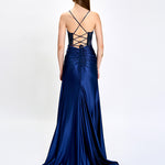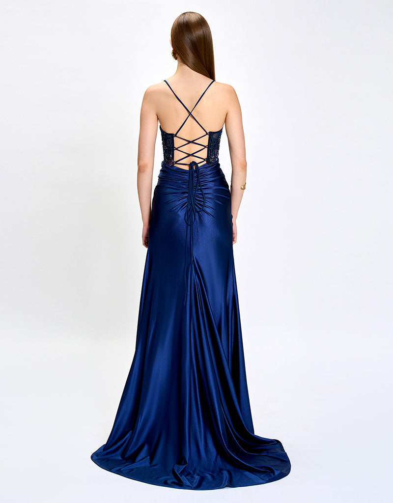 This gown is designed with a sweetheart neckline and slender straps that frame the shoulders, finished with a strappy back detail. The semi-sheer corset bodice is intricately embellished with sequins and structured with boning for definition. A draped full-length skirt falls into a fluid train, cut with a thigh-high split for added movement. Fully lined and secured with an invisible zip closure at the back.