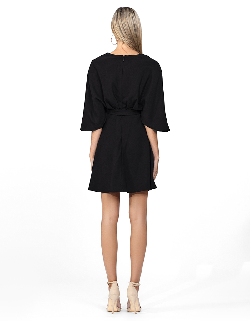 Say hello to your next staple dress for special occasions. The sky mini dress is perfect to wear from day to night, paired with casual shoes or heels. She features cape sleeves and wrap skirt and bodice to show off your waist.