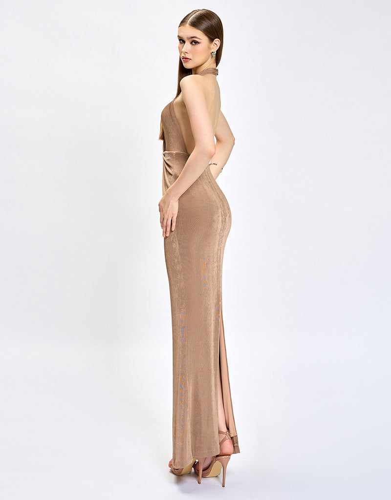 Elegant and contemporary, this full-length gown is crafted from fluid drape jersey for a sleek, figure-flattering finish. Featuring a plunging halter neckline with a twisted front detail and a gathered bodice, it highlights the shoulders while revealing an open low back for added drama. The cinched waistline with a soft draped effect enhances the silhouette, flowing into a full-length column skirt with a back split for graceful movement. Fully lined and finished with an invisible back zip, this gown is perfect for formal events and special occasions.