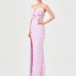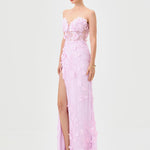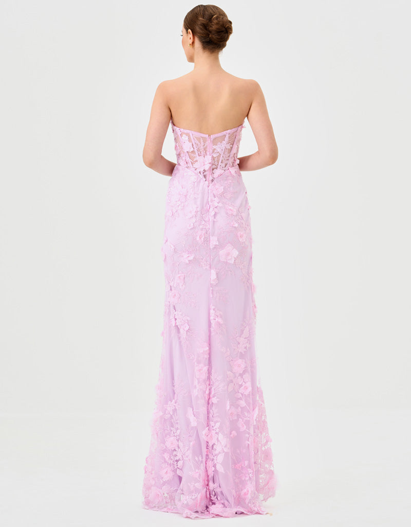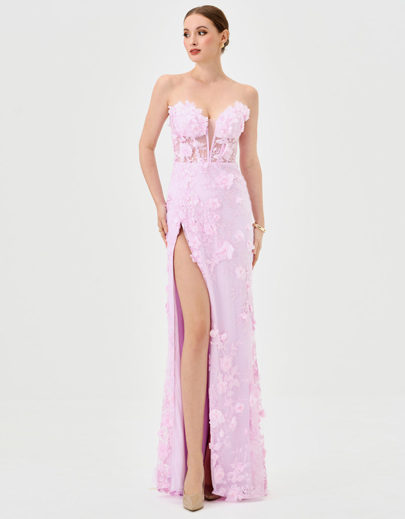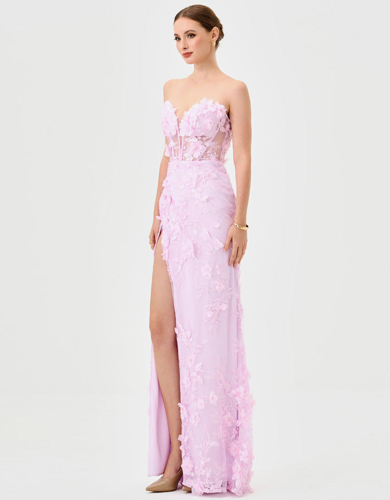 This gown is designed with a plunging sweetheart neckline, balanced by built-in cups and a sheer mesh insert for coverage. The fitted bodice is crafted from floral lace with exposed boning for structure, while the floor-length skirt is detailed with a thigh-high split for ease of movement. Partially lined through the bodice and fully lined through the skirt, finished with an invisible zip closure at the back.