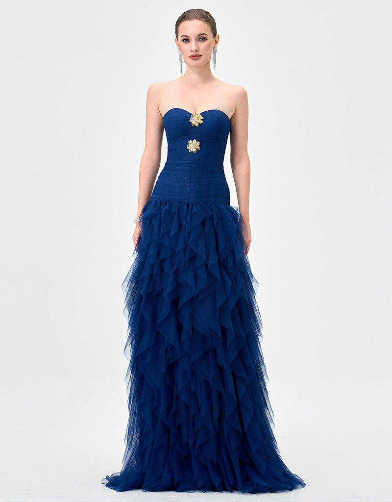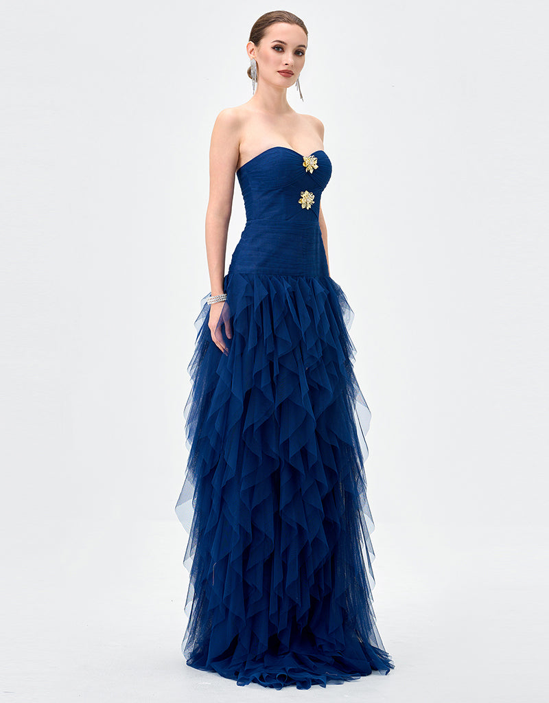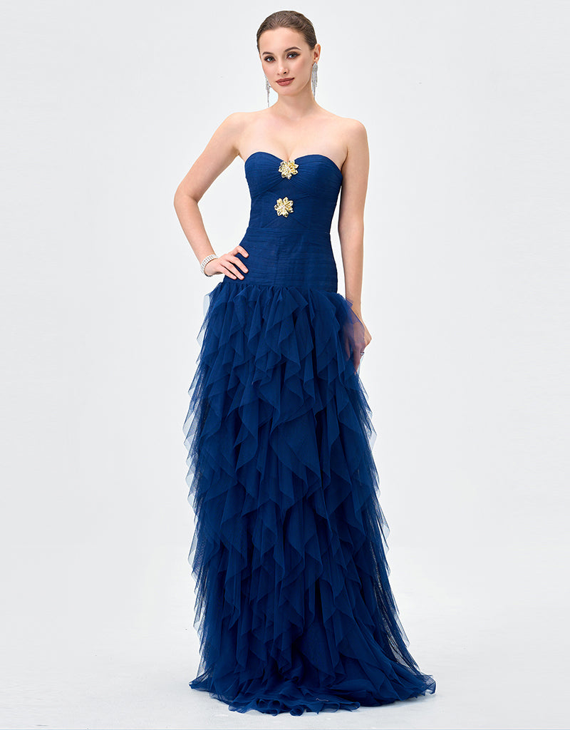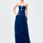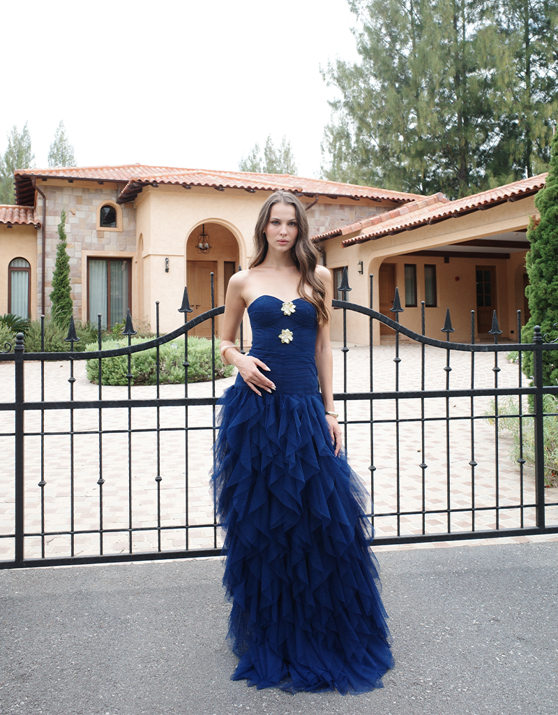 Make a striking entrance in this statement strapless gown, designed to captivate with its sculptural silhouette and refined detailing. Featuring a sweetheart neckline, the fitted bodice is softly textured and accented with delicate embellishment at the centre front for a touch of glamour. The silhouette flows into a full-length skirt crafted from layers of cascading tulle, creating dramatic volume and fluid movement. Fully lined for comfort and designed to flatter the figure, this gown is a standout choice for black tie events, formals, and evening occasions where elegance is key.