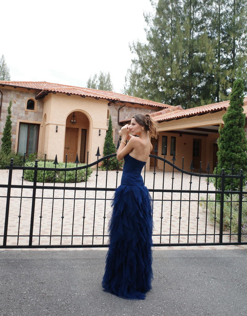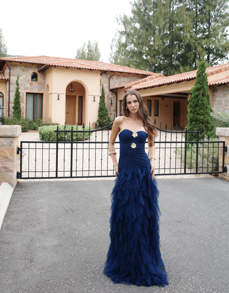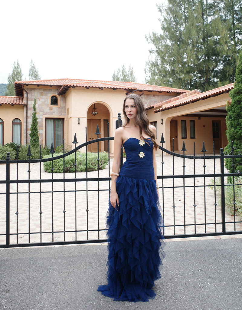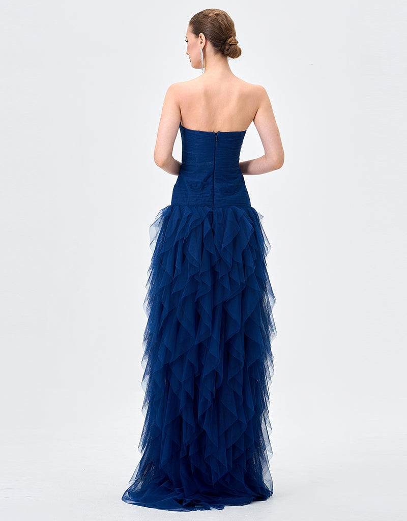 Make a striking entrance in this statement strapless gown, designed to captivate with its sculptural silhouette and refined detailing. Featuring a sweetheart neckline, the fitted bodice is softly textured and accented with delicate embellishment at the centre front for a touch of glamour. The silhouette flows into a full-length skirt crafted from layers of cascading tulle, creating dramatic volume and fluid movement. Fully lined for comfort and designed to flatter the figure, this gown is a standout choice for black tie events, formals, and evening occasions where elegance is key.