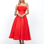 Tuned into your feminine energy in the sophisticated Itzi. Dazzle in the perfect midi length flared skirt and ruffle bust detailing, you won't be able to take your eyes off the dress as the skirt floats with every moment