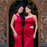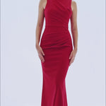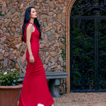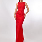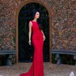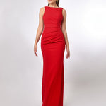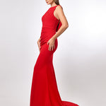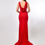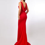 Step into elegance with this stunning gown, featuring a sophisticated covered high neckline with built-in bust cups for a sleek and polished look. The gathered side detail across the bustier and the top of the skirt adds a touch of texture and highlights your silhouette beautifully. The dramatic draped cowl back feature creates a striking contrast to the modest front, making a lasting impression as you move. The full-length fishtail skirt, complete with a back train, flows effortlessly, adding a sense of grandeur to your entrance. Fully lined for comfort, this gown is finished with an invisible back zip closure for a flawless fit. Crafted from luxurious stretch crepe, this dress combines classic elegance with modern sophistication, perfect for making an unforgettable statement at any special event.