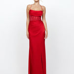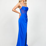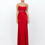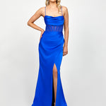 The sheer corset waist adds structure and shape, enhancing your curves with a bold yet feminine touch. An open V-back with an adjustable lace-up feature allows for a perfect, customizable fit, giving the gown a flattering, tailored look from every angle. The full-length fishtail skirt features delicate pleat detailing, adding texture and movement, while a high side front split offers a hint of drama and allure.