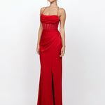 Our Posh Strapless Corset Gown with Draped Satin & Fishtail Skirt makes you Step into luxury with the stunning strapless corset bodice, designed to turn heads and elevate your style at any formal occasion. The elegantly draped neckline, paired with a pleated overlay feature, creates a soft, flowing effect that beautifully frames the bust. Thin straps provide subtle support while maintaining the dress's sophisticated appeal.