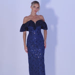Turn heads in this striking flower sequin taffeta dress, designed with an off-shoulder sweetheart neckline and a bold contrast ruffle sleeve for dramatic flair. A subtle modesty mesh insert adds balance, while the fitted bodice with boning ensures structure and support. The midaxi-length column skirt features a back split for ease of movement and a touch of allure. Finished with an invisible back zip and partial lining, this dress is perfect for cocktail parties, formal dinners, or any event where standout elegance is a must.