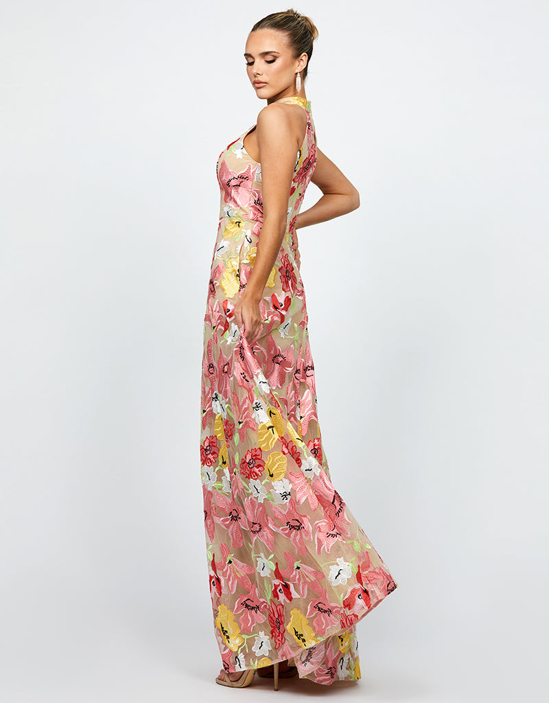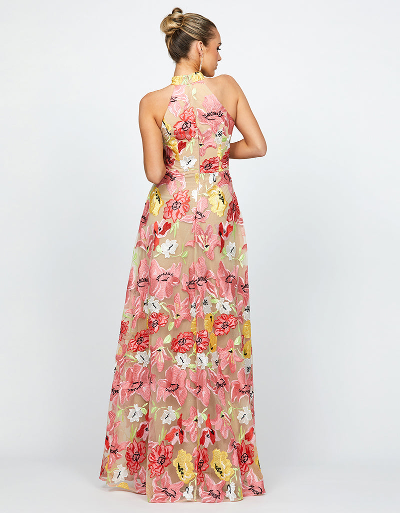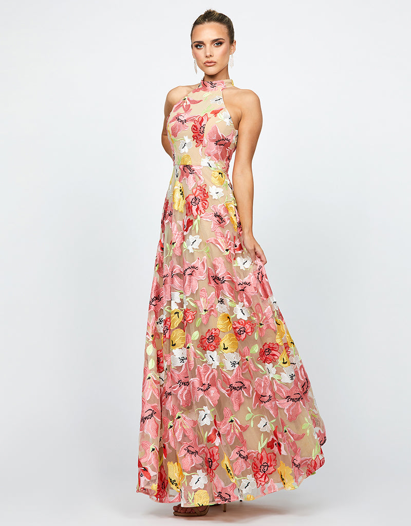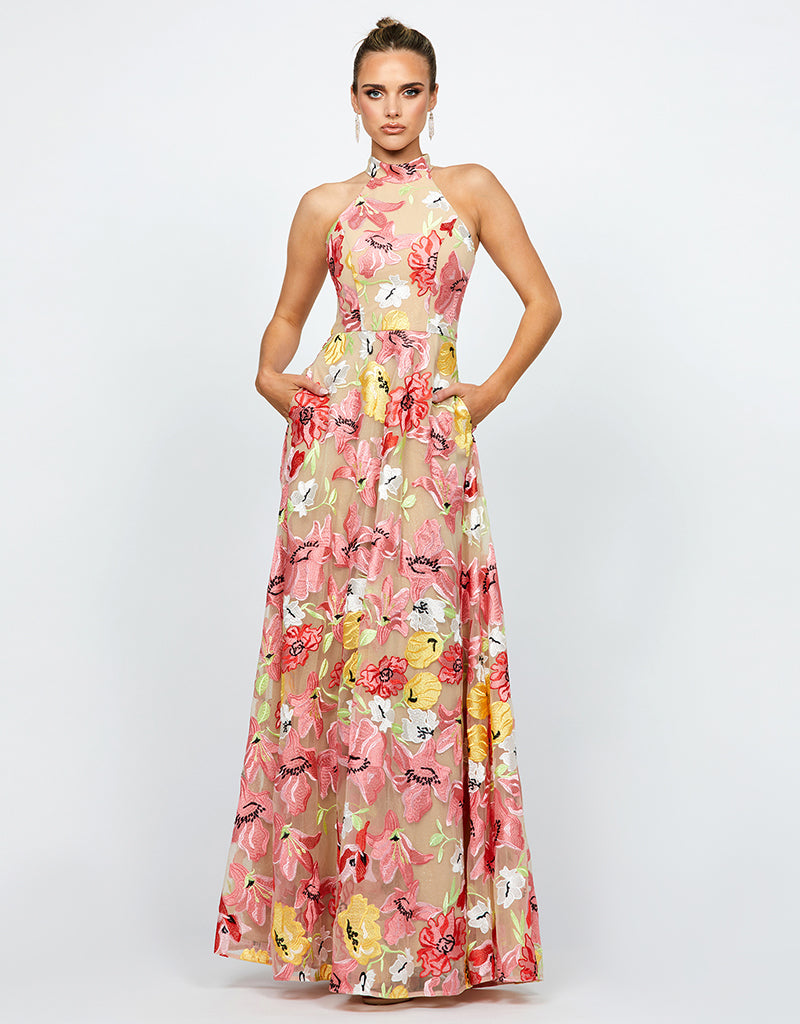 The Delaney High Neck gown is a timeless statement of elegance and sophistication. Featuring a high covered neckline with a chic short collar detail, this design offers a refined yet modern touch. The keyhole back feature adds a hint of allure, while the structured bodice with boning and built-in cups ensures a secure and flattering fit. Flowing effortlessly, the full-length draped A-line skirt creates graceful movement, and the addition of side pockets adds both style and convenience. Crafted from delicate embroidered mesh with floral detailing, this gown is finished with an invisible back zip closure and full lining, making it the perfect choice for any special occasion.