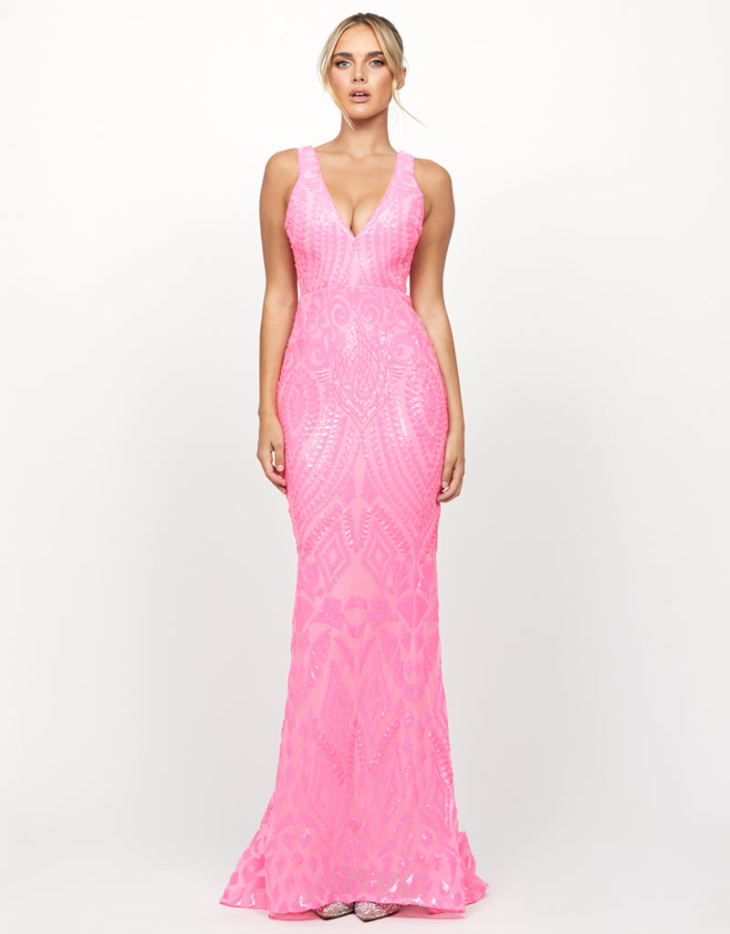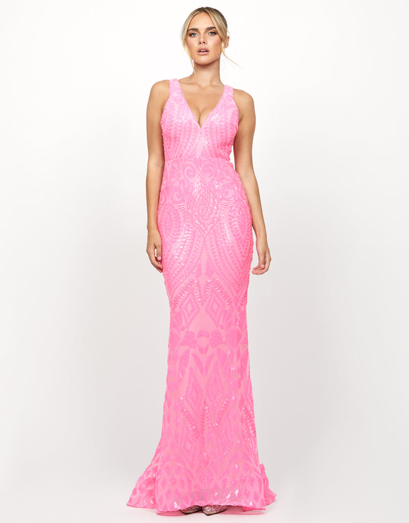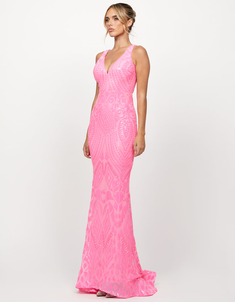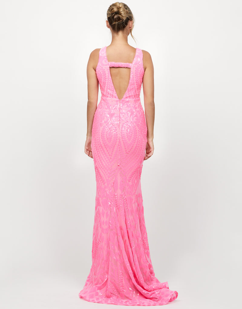 Turn heads at your special occassion in this glamorous sequin gown! With a daring plunge V-neckline and supportive thick straps, the built-in cups ensure a flawless fit. The open V-back with an elasticated band adds a chic touch, while the full-length fishtail skirt with a sweeping train creates a show-stopping silhouette. Fully lined with an invisible back zip, it’s the perfect choice for a night to remember!