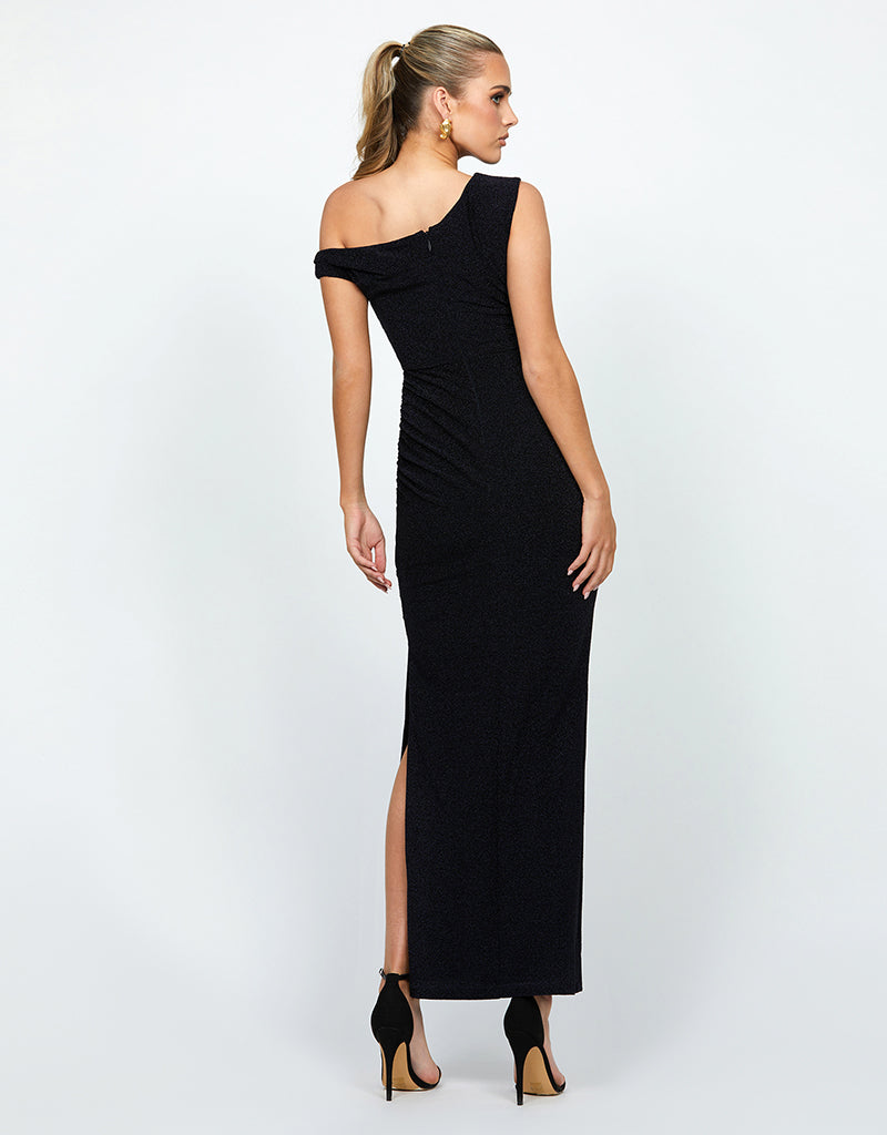 A statement piece designed to shine. Featuring an asymmetrical neckline with a single sleeve detail, this dress exudes modern elegance with a touch of edge. The tapered waistline is enhanced by gathered detailing at the top of the skirt, creating a flattering silhouette that highlights your curves.