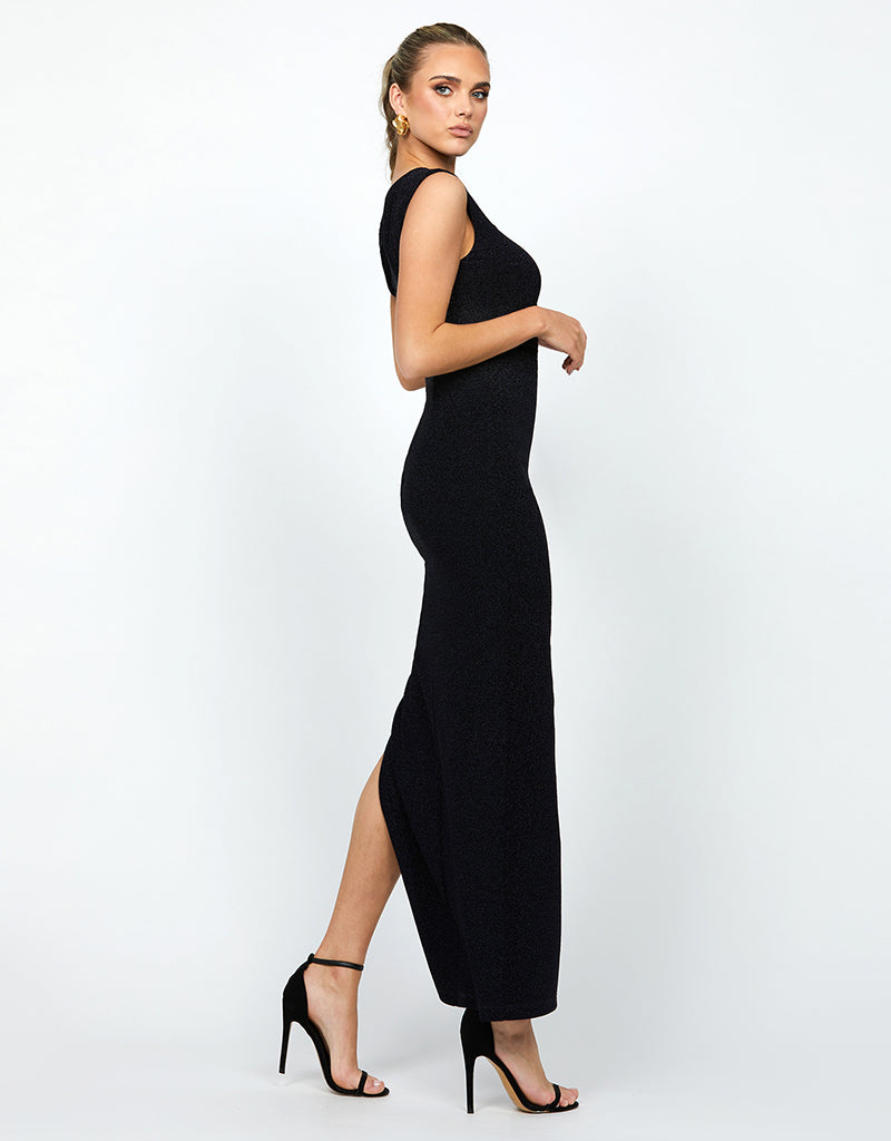 The column-style midaxi skirt offers a sleek, elongated fit, complete with a side split for just the right amount of allure. Crafted from shimmering metallic jersey, this dress catches the light beautifully, making it perfect for evening events and special occasions.