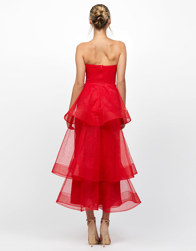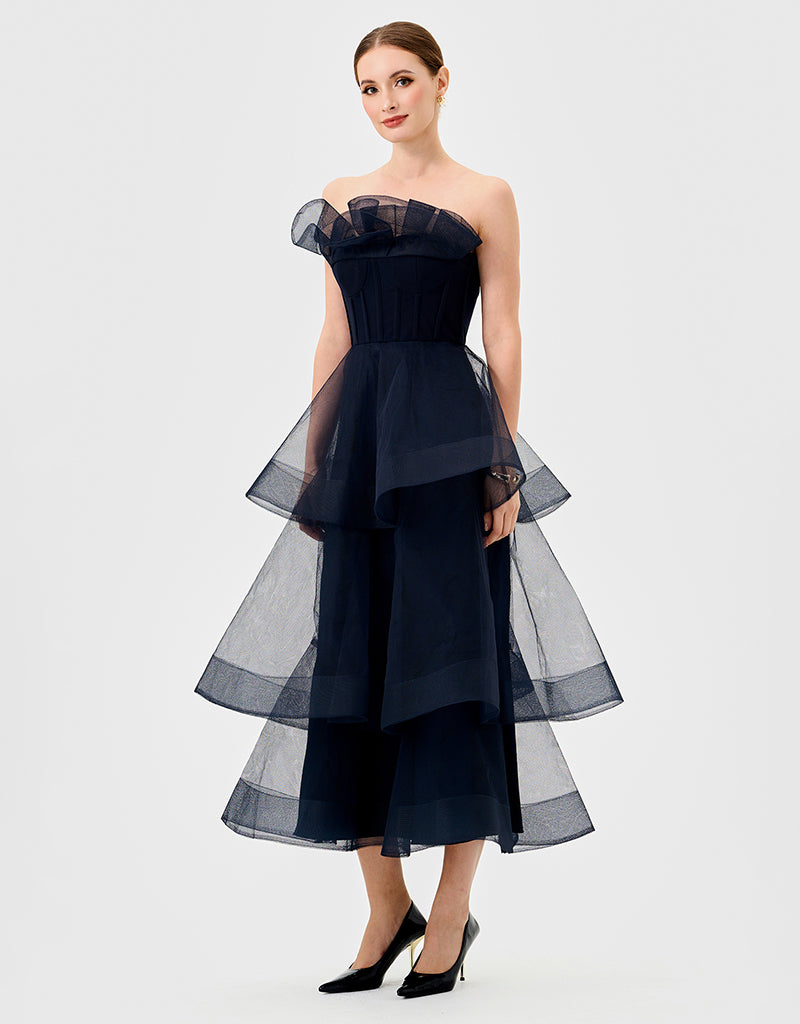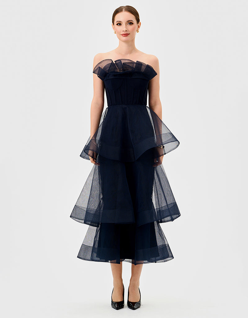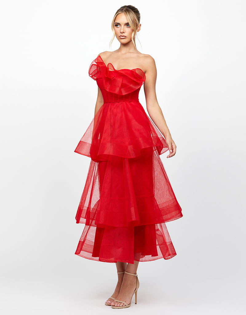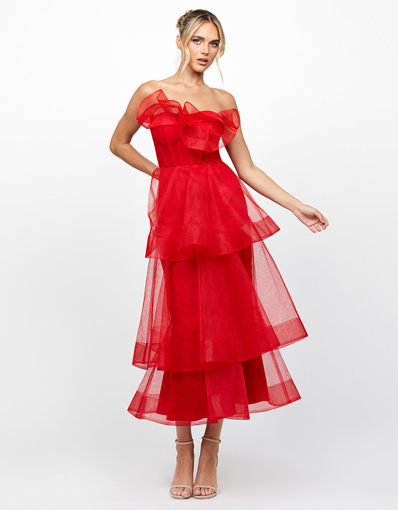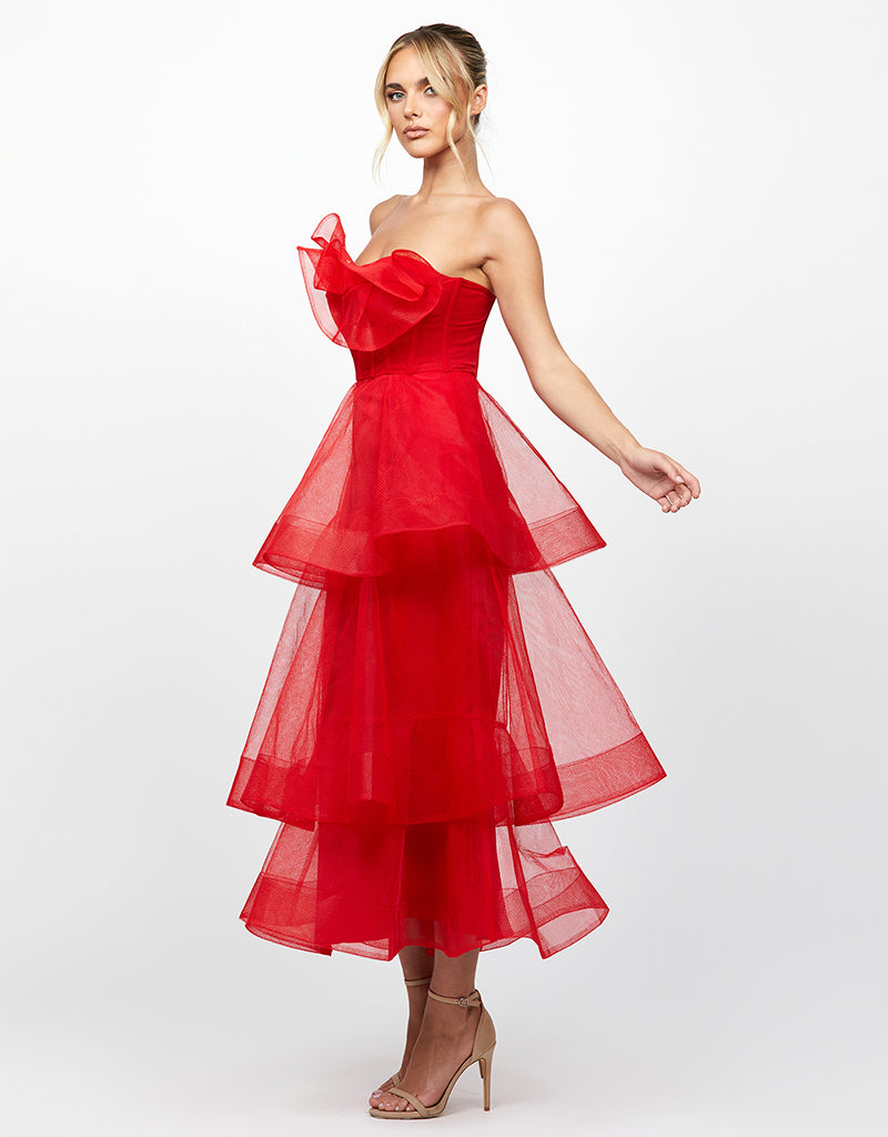 Whimsical yet striking, this tulle midaxi gown is the perfect blend of romantic detail and modern structure. The strapless sweetheart neckline is elevated with a dramatic ruffle overlay, drawing attention to the décolletage. The structured bodice features exposed boning and built-in cups for a secure and sculpted silhouette. Falling to a playful midaxi length, the skirt is adorned with tiered layers of soft tulle that add volume and movement. Fully lined with an invisible back zip, this gown is made for twirling into your next special event.