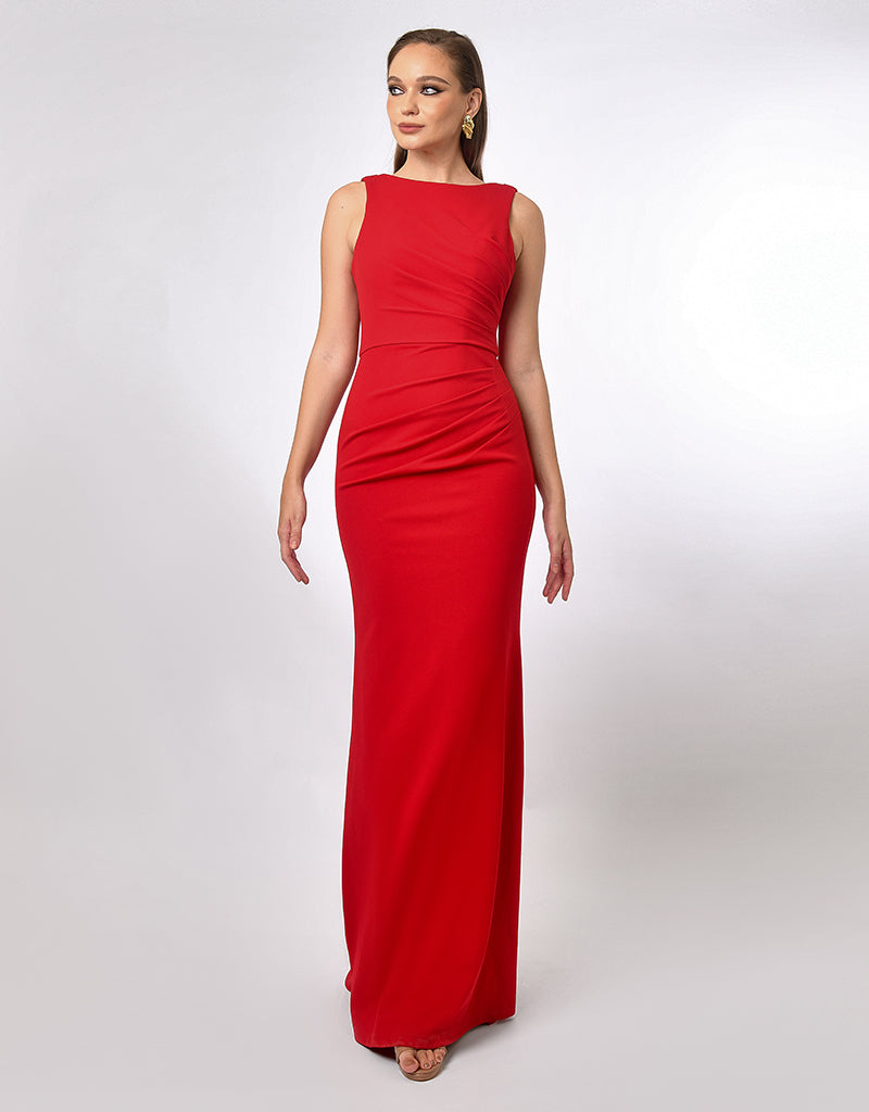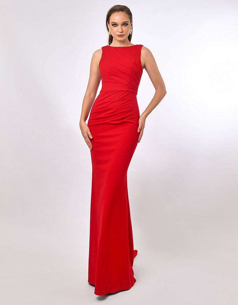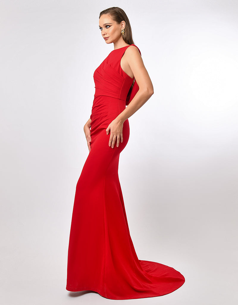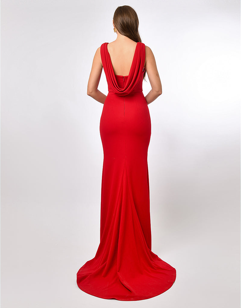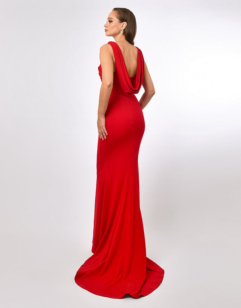 Step into elegance with this stunning gown, featuring a sophisticated covered high neckline with built-in bust cups for a sleek and polished look. The gathered side detail across the bustier and the top of the skirt adds a touch of texture and highlights your silhouette beautifully. The dramatic draped cowl back feature creates a striking contrast to the modest front, making a lasting impression as you move. The full-length fishtail skirt, complete with a back train, flows effortlessly, adding a sense of grandeur to your entrance. Fully lined for comfort, this gown is finished with an invisible back zip closure for a flawless fit. Crafted from luxurious stretch crepe, this dress combines classic elegance with modern sophistication, perfect for making an unforgettable statement at any special event.