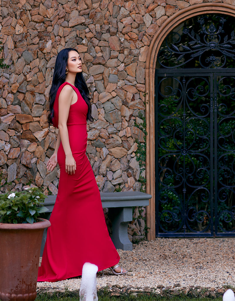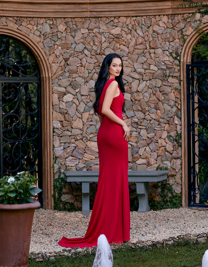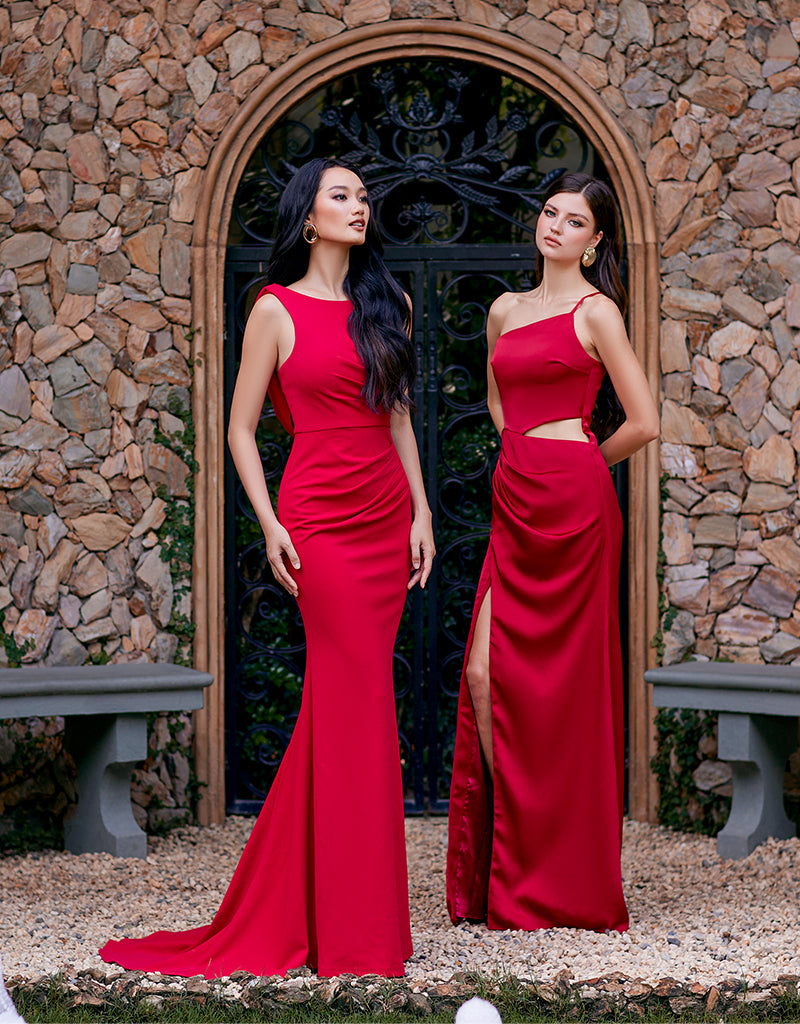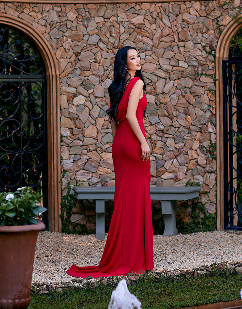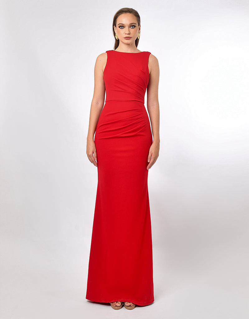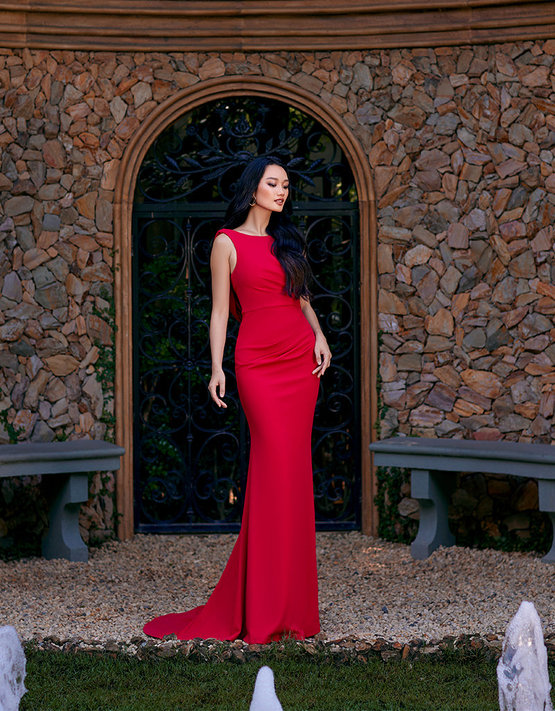 Step into elegance with this stunning gown, featuring a sophisticated covered high neckline with built-in bust cups for a sleek and polished look. The gathered side detail across the bustier and the top of the skirt adds a touch of texture and highlights your silhouette beautifully. The dramatic draped cowl back feature creates a striking contrast to the modest front, making a lasting impression as you move. The full-length fishtail skirt, complete with a back train, flows effortlessly, adding a sense of grandeur to your entrance. Fully lined for comfort, this gown is finished with an invisible back zip closure for a flawless fit. Crafted from luxurious stretch crepe, this dress combines classic elegance with modern sophistication, perfect for making an unforgettable statement at any special event.