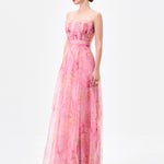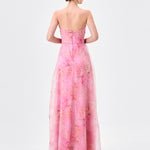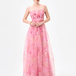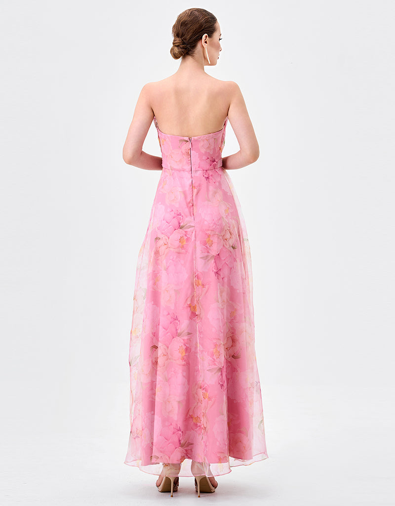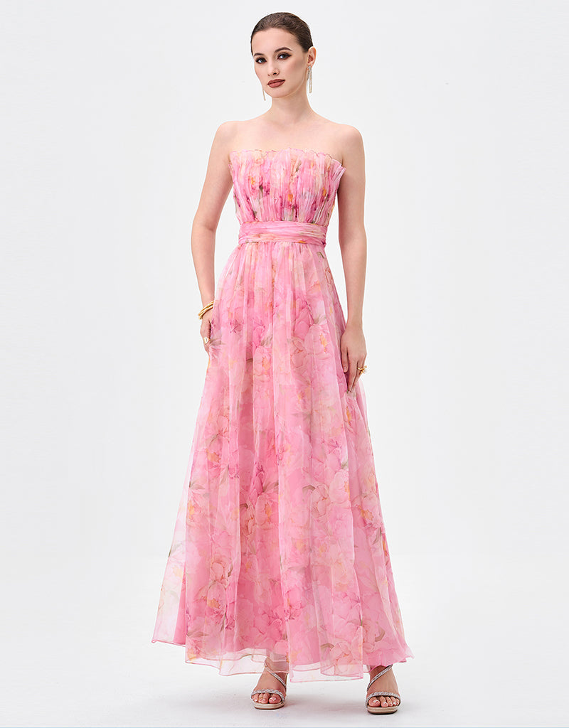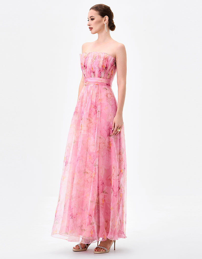Designed for effortless elegance, this strapless gown features a straight neckline with soft pleated detailing for a refined finish. The fitted bodice is shaped with a flattering waistband that defines the waist, before flowing into a full-length A-line skirt with gentle gathers for movement and femininity. Crafted from printed soft organza and fully lined for comfort, this style is finished with an invisible zip at the back, making it an ideal choice for formal occasions and special events.