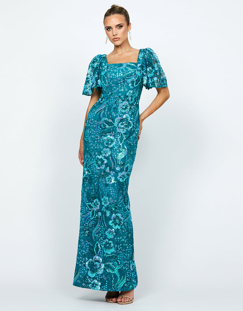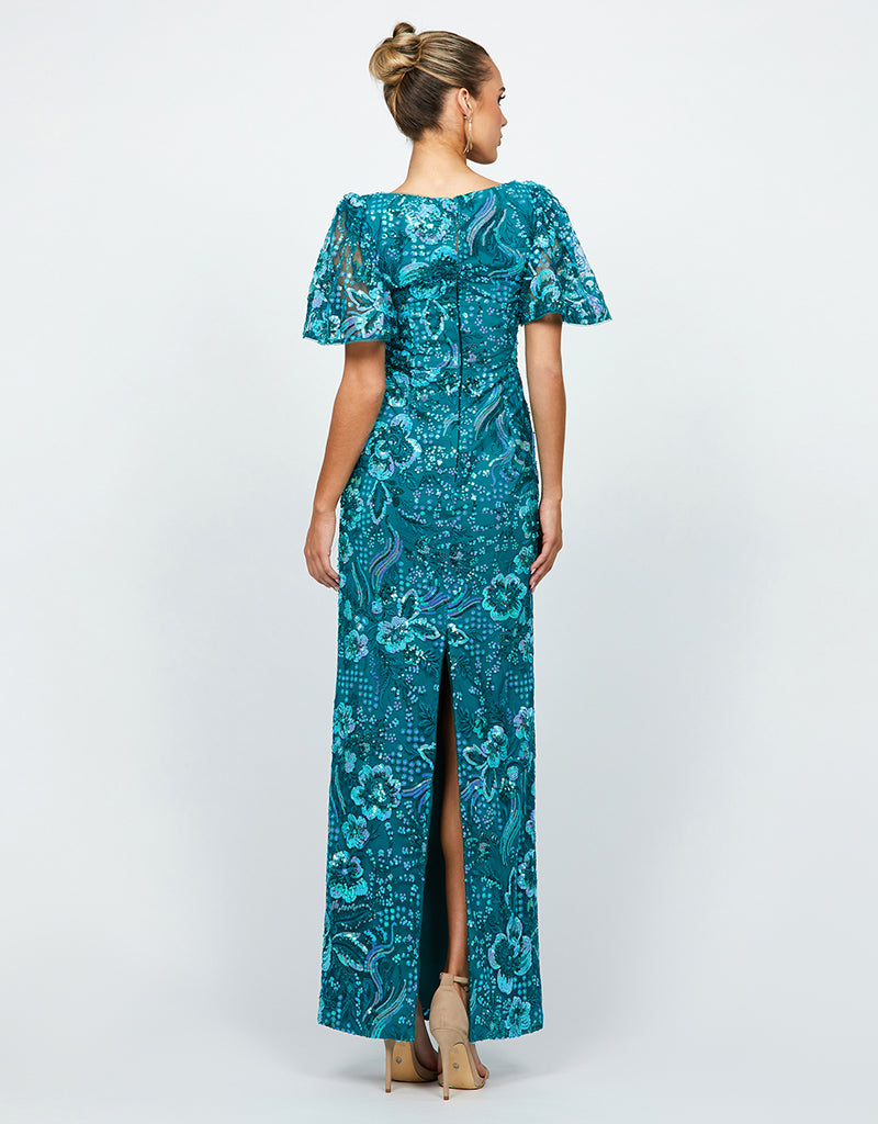 Turn heads in this stunning embroidered sequin gown, designed for effortless glamour and timeless elegance. Featuring a sophisticated square neckline and delicate sheer flutter sleeves, this dress is the perfect blend of modern refinement and classic beauty. The structured bodice, complete with a keyhole back opening and built-in cups, ensures a flattering and supportive fit.