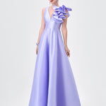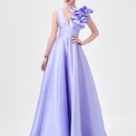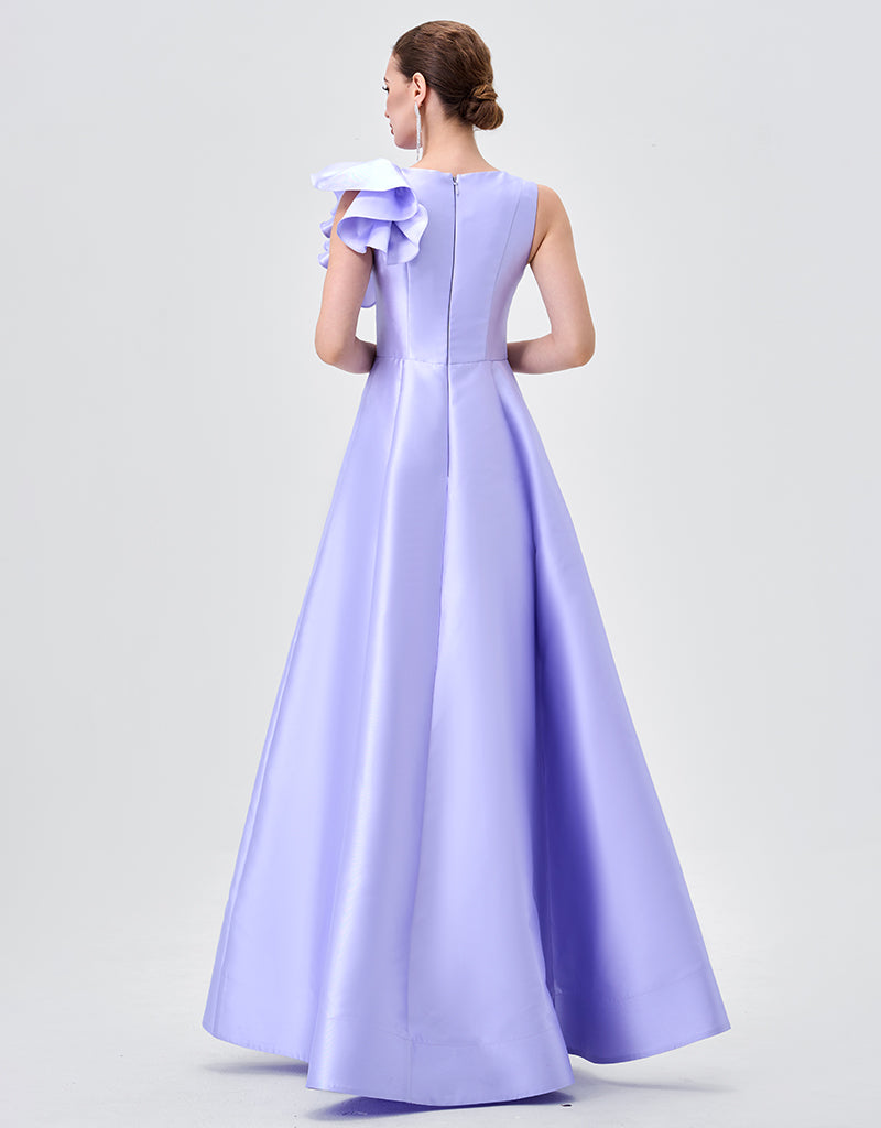 An elegant statement in fluid Duchess Satin, this full-length gown balances drama with refined structure. A plunging V neckline is framed by a sculptural ruffle shoulder, creating striking visual impact while drawing the eye upward. The fitted bodice features built-in bust cups and a wide waistband, offering both support and a beautifully defined silhouette. Falling into a full-length A-line skirt, the design moves with effortless grace and is discreetly finished with in-seam pockets for modern practicality. Fully lined for a smooth finish and secured with an invisible back zip, this piece is designed for formal evenings, weddings, and elevated occasions.
