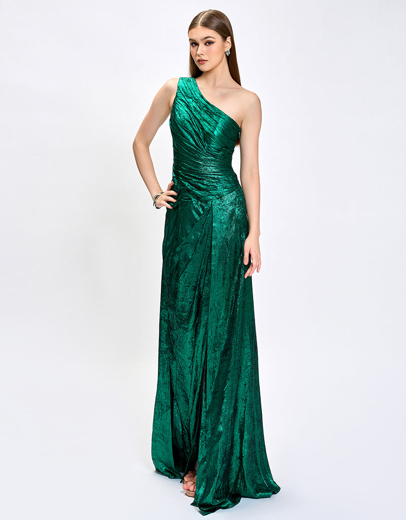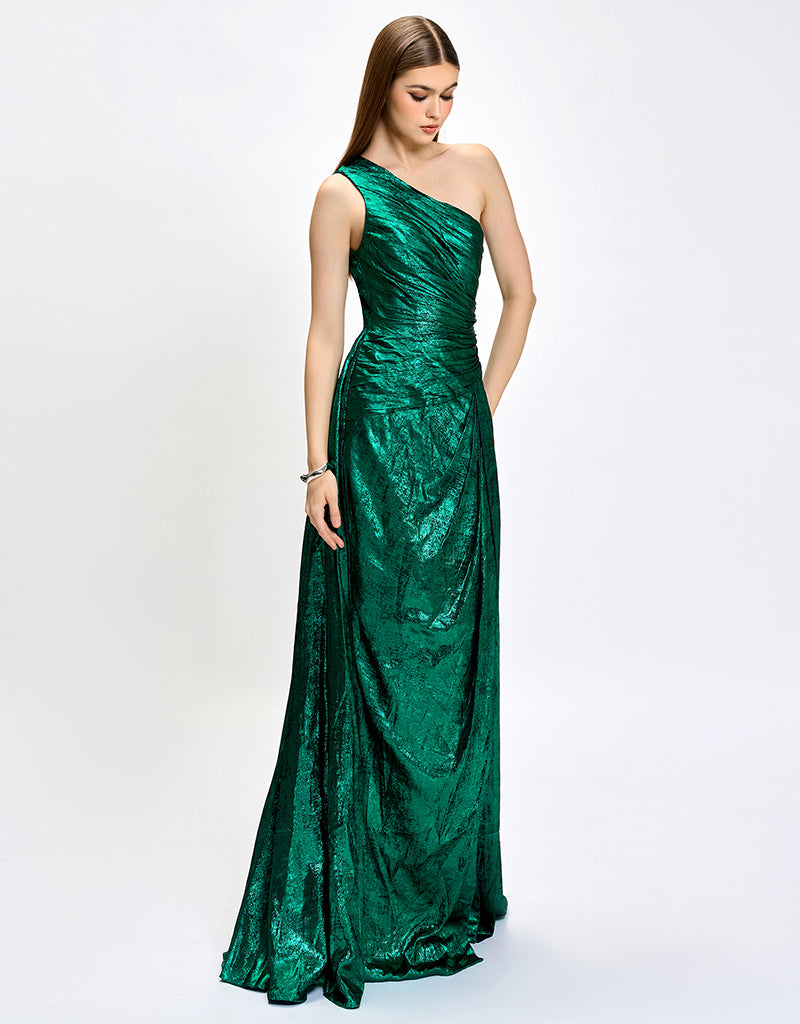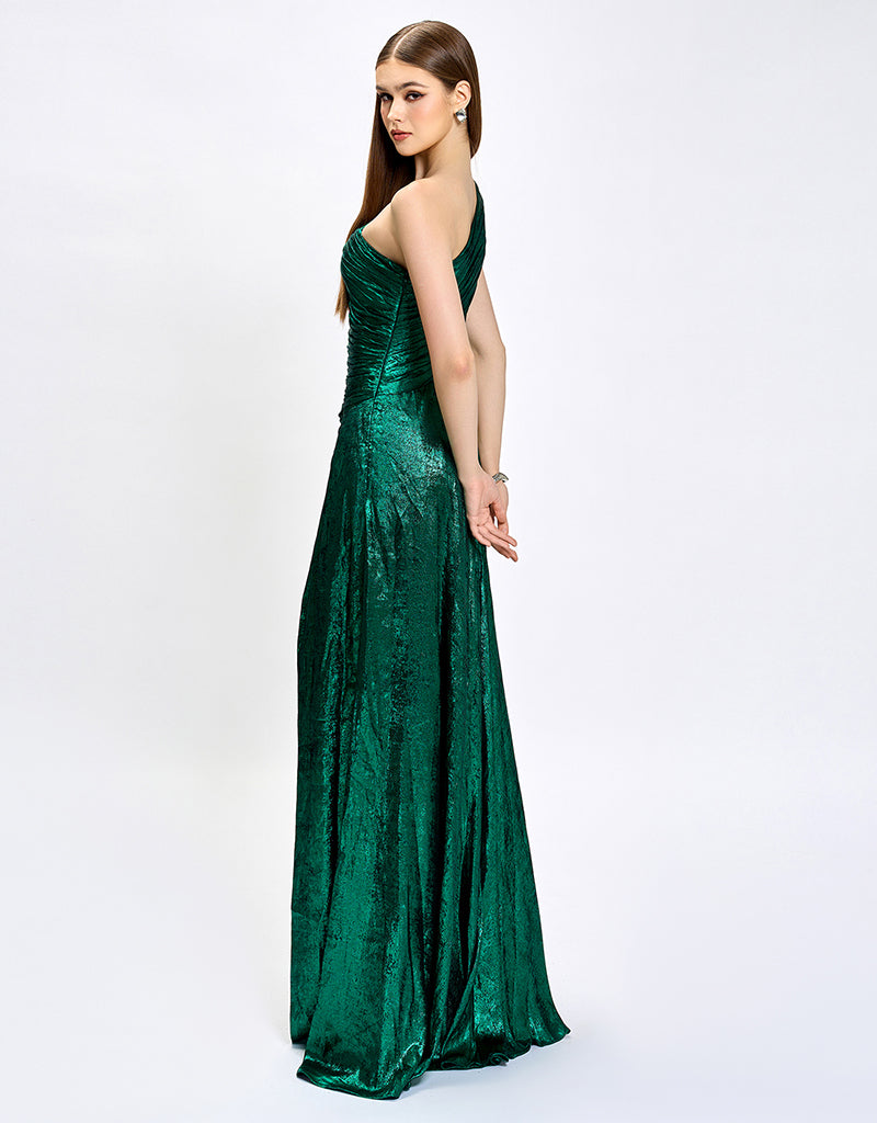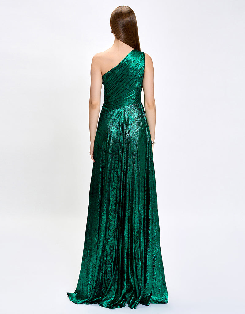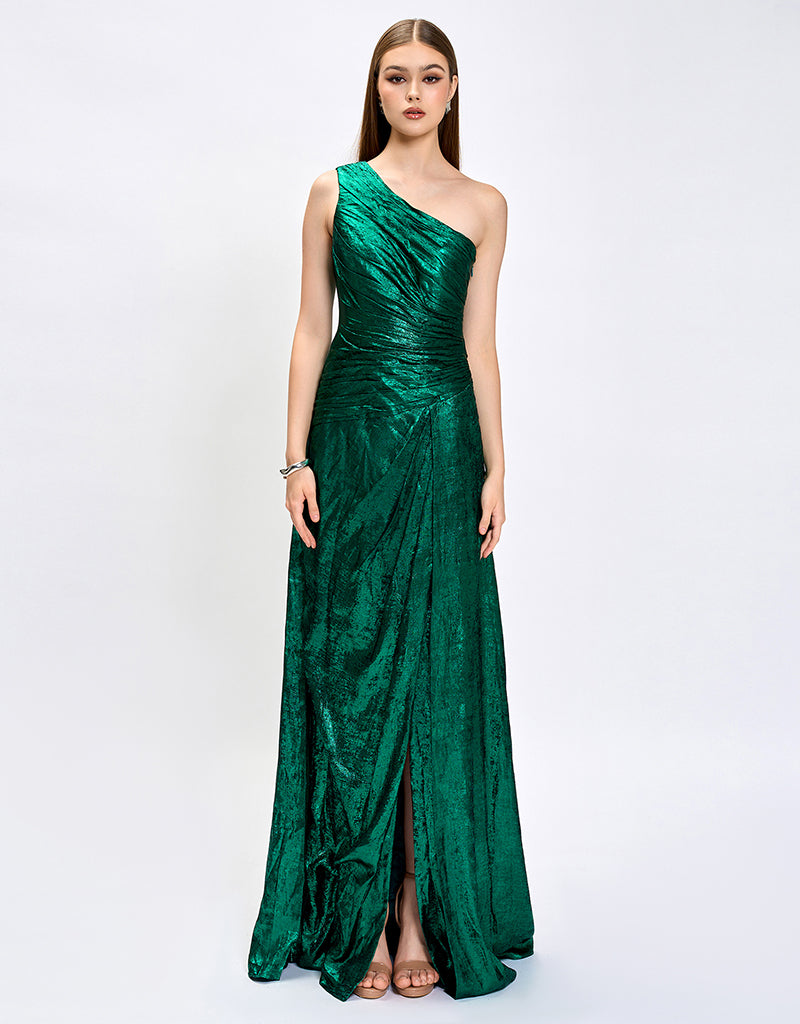 Turn heads in this stunning one-shoulder gown, designed for effortless elegance with a touch of drama. The one-shoulder neckline is accented by a detachable oversized bow, offering a bold yet refined look. The ruched bodice with built-in cups provides a secure and flattering fit, while the full-length draped A-line skirt flows gracefully, featuring a side split for a hint of allure. Crafted from shimmering metallic poly, this gown catches the light beautifully, ensuring a dazzling entrance. Finished with an invisible side zip closure and full lining, it’s the perfect choice for any special occasion