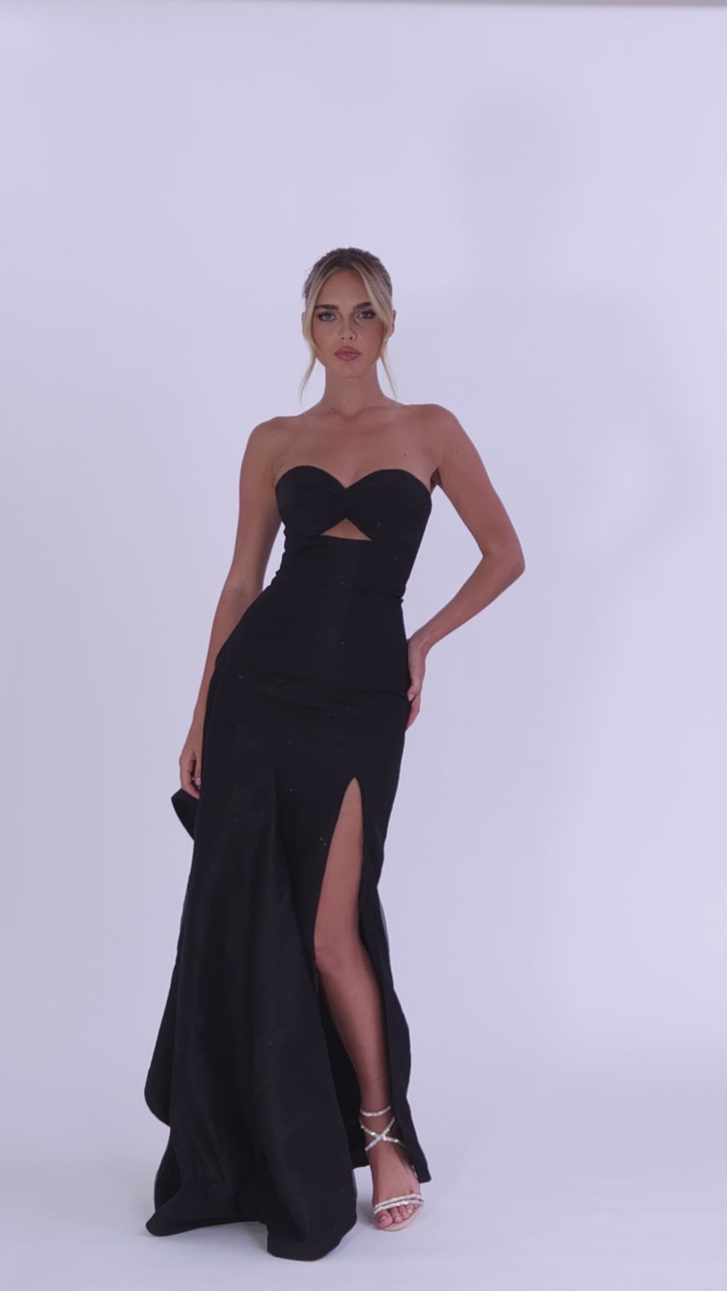 Command attention in this glamorous glitter organza gown, featuring a gathered sweetheart strapless neckline with a daring under-bust cut-out detail for a modern edge. The fitted bodice with built-in bust cups ensures a flattering, supportive fit, while the full-length column skirt offers sleek sophistication with a front side split for added allure. An off-body ruffle overlay adds dramatic movement and texture, creating a truly unforgettable silhouette. Fully lined and finished with an invisible back zip closure, this gown is perfect for making a sparkling statement at any formal event or special occasion.