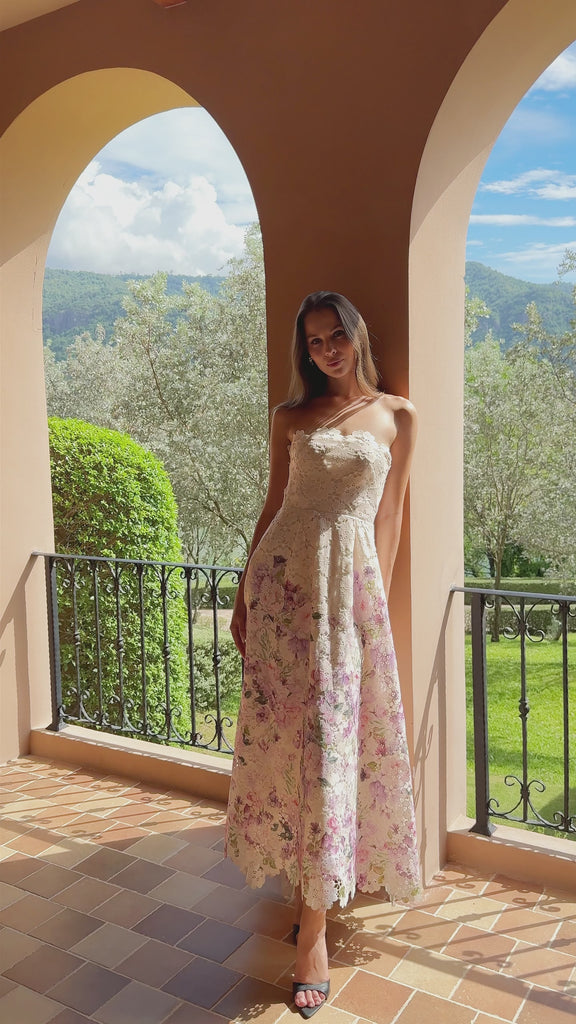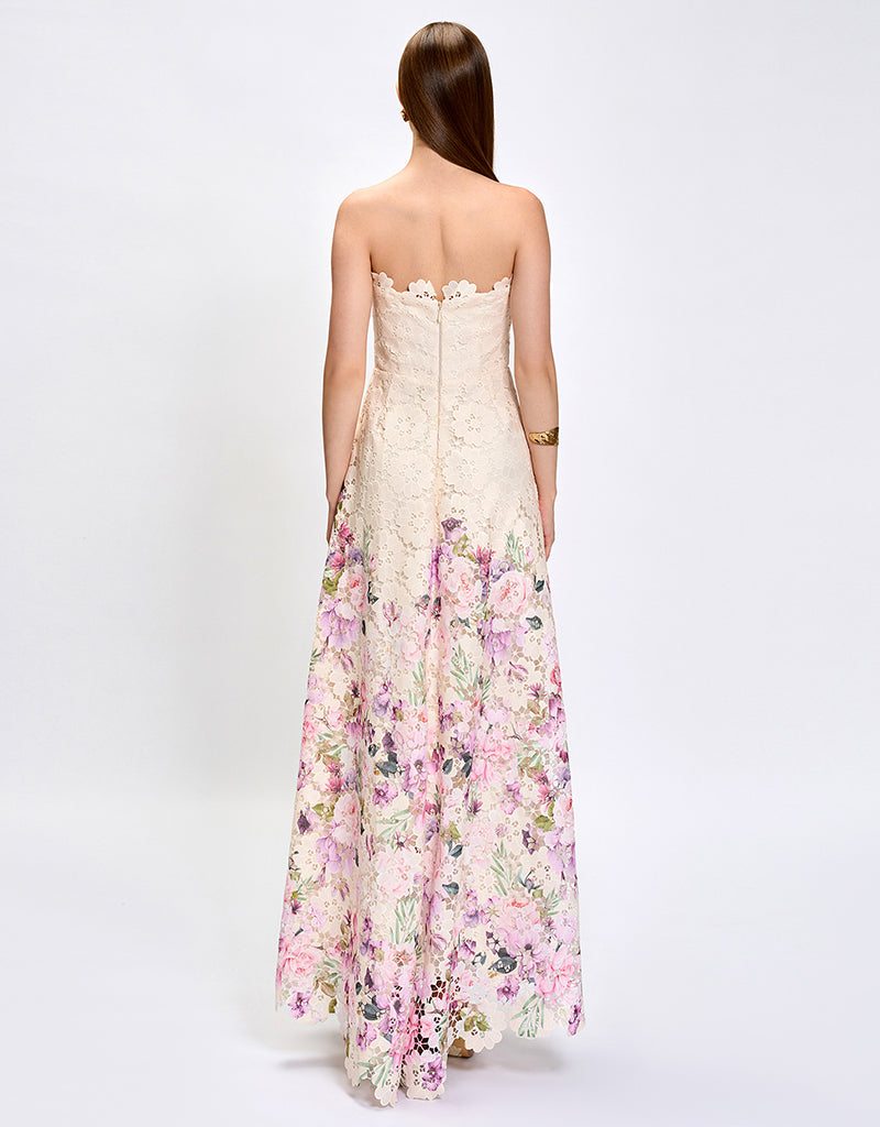 Elegant and eye-catching, this strapless mini dress is crafted from luxurious thick lace with a gradual floral ombre effect for a romantic finish. Featuring a straight neckline with delicate scalloped edge detail, it highlights the shoulders and décolletage. The fitted bodice with built-in bust cups provides shape and support, while the hi-lo A-line skirt adds movement and dimension, finished with a scalloped hem for extra charm. Fully lined and completed with an invisible back zip, this dress is perfect for special occasions where you want to make a statement.