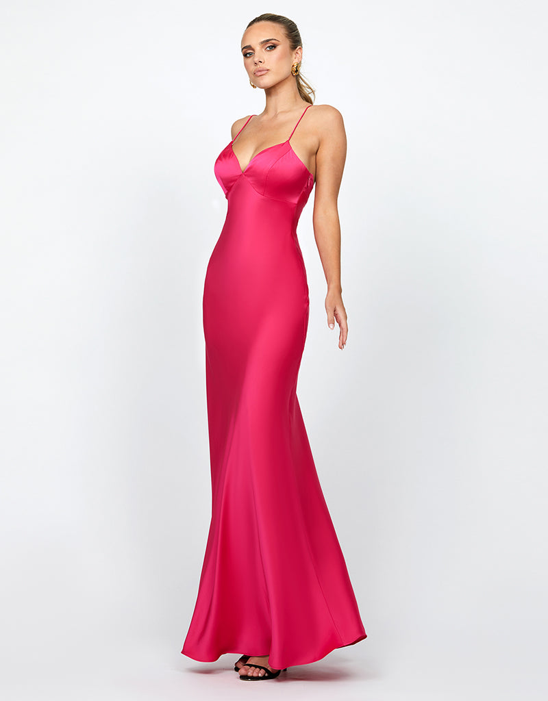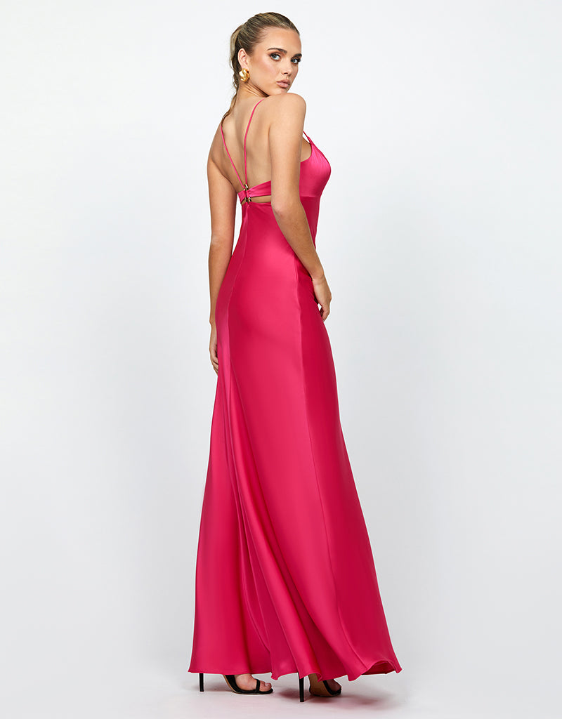 A bold and elegant choice for your next event. Featuring a plunging sweetheart neckline with delicate spaghetti straps, this gown offers a sleek and flattering silhouette. The open back detail, accented with gold metal hardware trim, adds a luxe touch of glamour.
