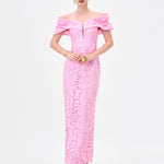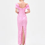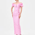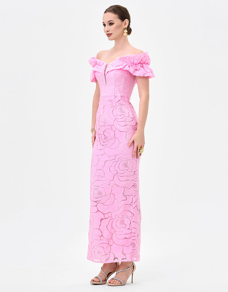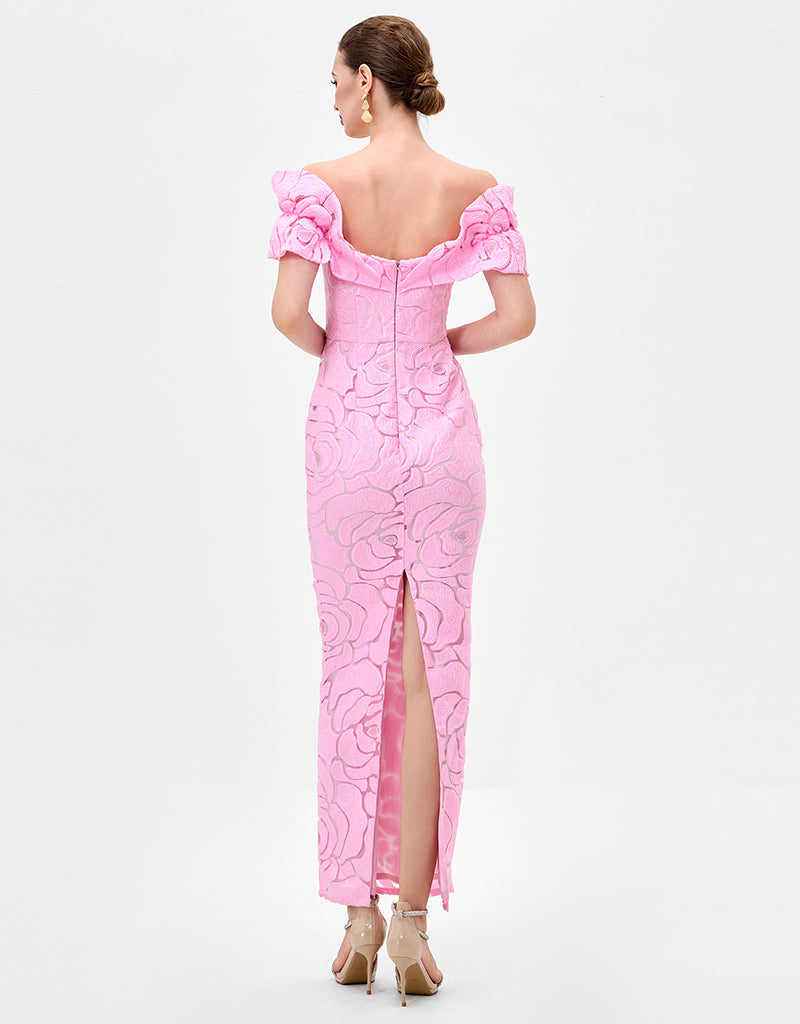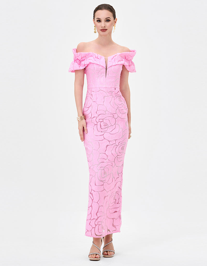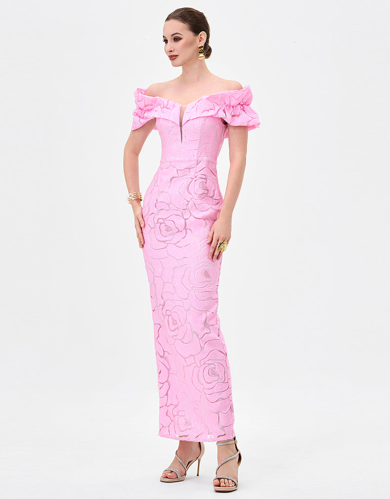This elegant off-shoulder midaxi dress, fabricated from romantic rose burnout jacquard with subtle stretch for a refined yet comfortable fit. Designed with bespoke off shouler sleeves and a sculpted bodice, the silhouette is enhanced by a sheer centre front modesty mesh panel for discreet coverage. The column skirt falls to a flattering midaxi length and features a back split for ease of movement. Fully lined and finished with an invisible zip closure at the back, this style is perfect for weddings, formal events, and evening occasions.