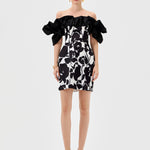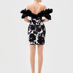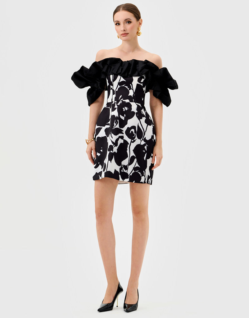 Cut with an off-shoulder neckline, this dress is defined by a voluminous bubble ruffle that frames the décolletage. The fitted bodice is shaped with paneled seams before falling to a bell-shaped mini skirt. Fully lined and finished with an invisible back zip for a clean close.