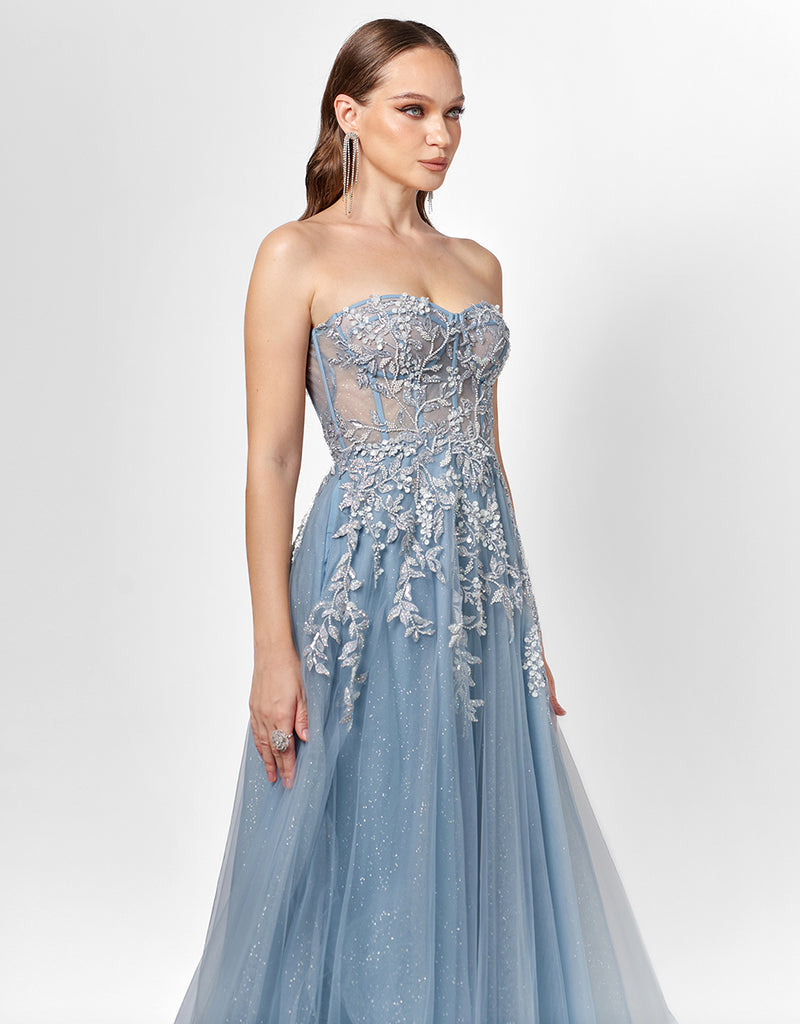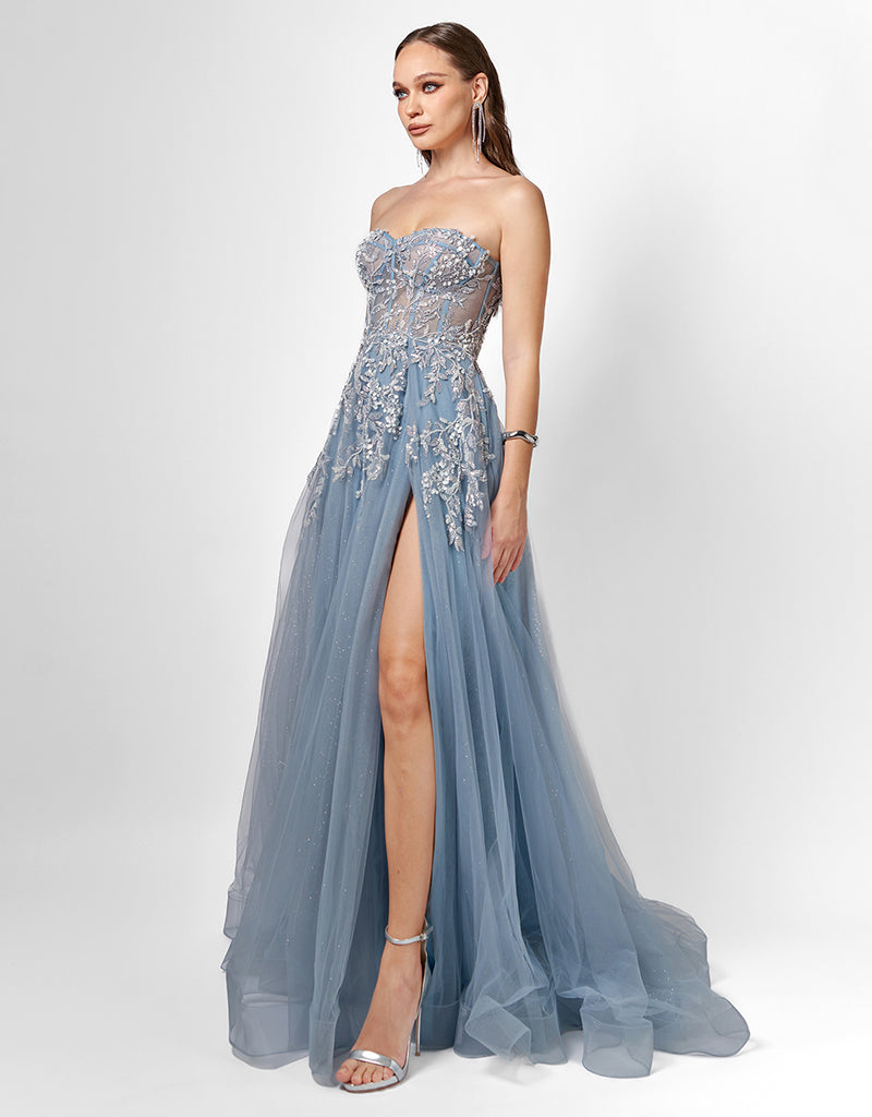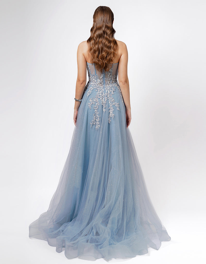 Make a grand entrance in the breath-taking Emmy gown. Designed to captivate, this statement piece features a romantic sweetheart neckline adorned with delicate beaded lace appliqué and structured taping detail. The sheer waist showcases a flattering corset panel with built-in cups, sculpting the bodice while adding a touch of drama. Flowing into a full-length ballgown skirt with a daring high side split, Emmy brings effortless glamour and grace to any special occasion. Finished with an invisible back zip and full lining for comfort and movement.