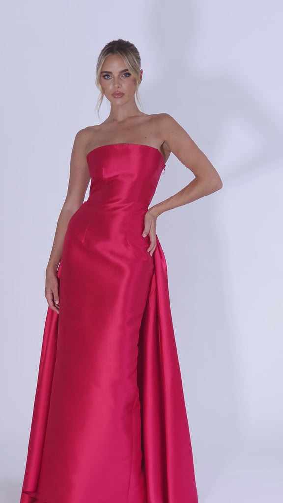 Step into timeless glamour with this strapless column gown, crafted from luxe duchess satin. The straight-across neckline and structured bodice with boning and built-in bust cups offer a flattering, secure fit. A sleek column skirt flows into an elegant A-line train at the back, with a subtle back split for ease of movement. Fully lined with an invisible zip closure, this show-stopping silhouette is made for grand entrances and unforgettable moments.