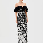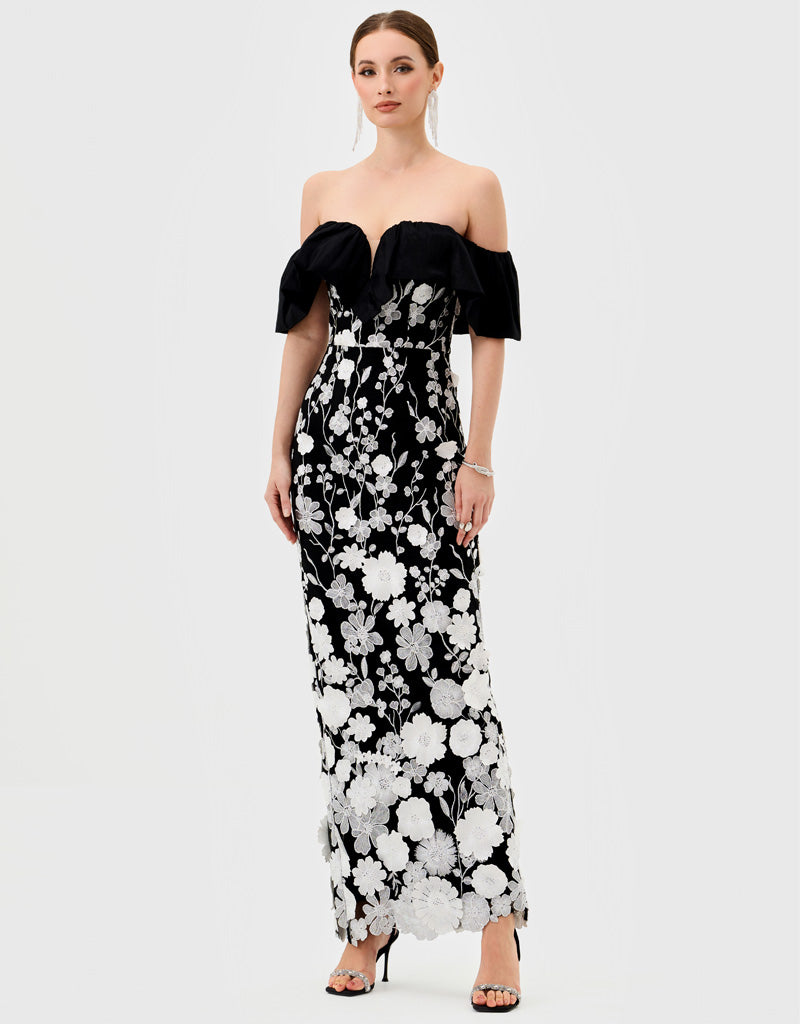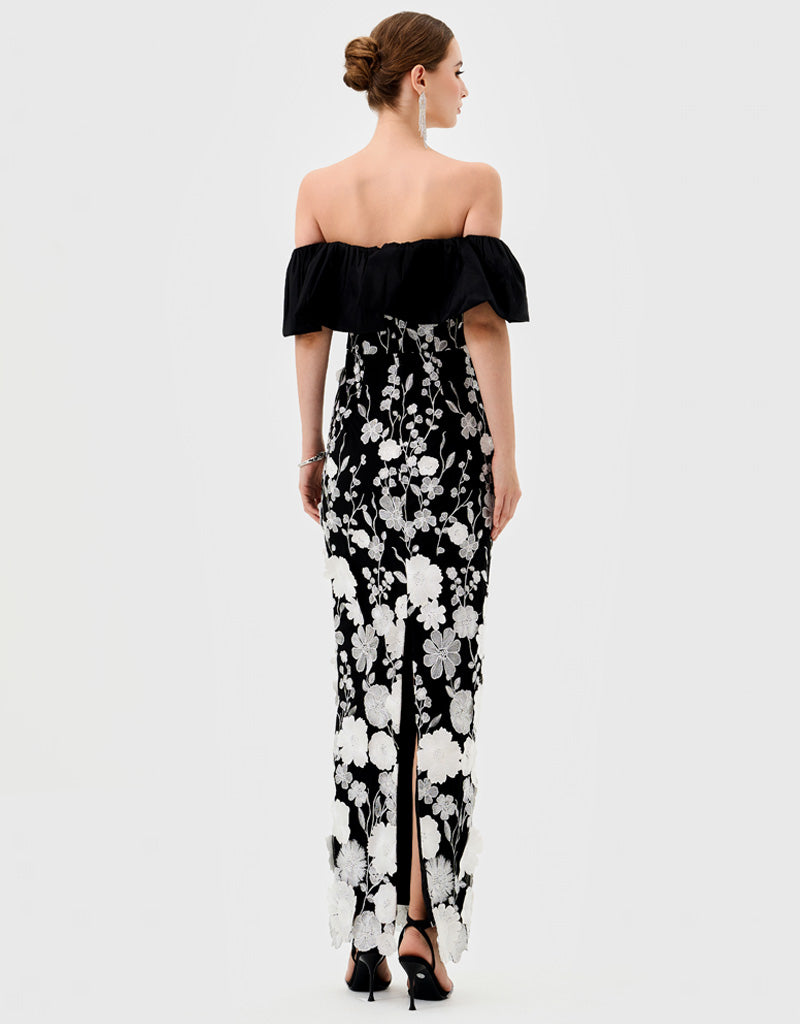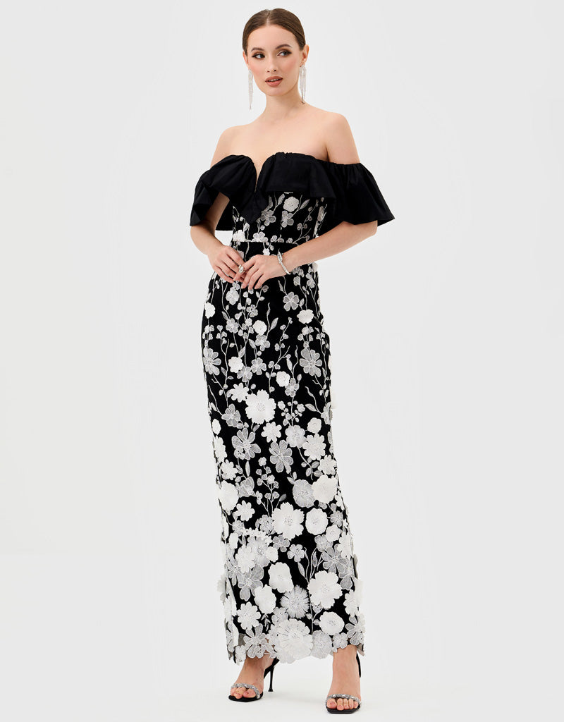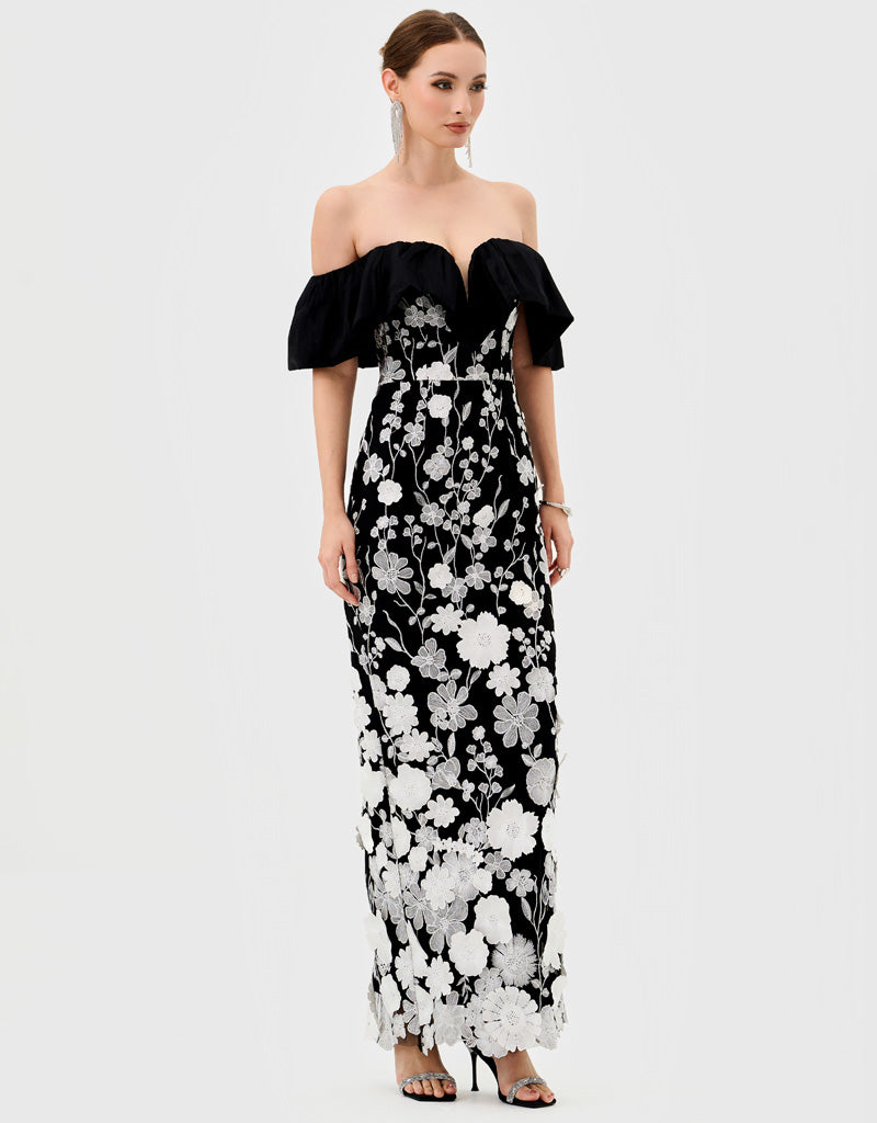 This gown is designed with an off-the-shoulder sweetheart neckline framed by a ruffled taffeta trim. The fitted bodice tapers into the waist before falling to a sleek full-length column skirt, finished with a back split for ease of movement. Fully lined and secured with an invisible back zip for a clean close.