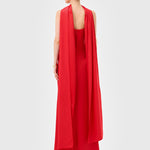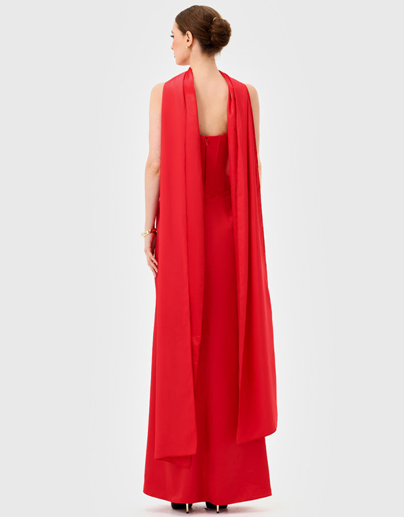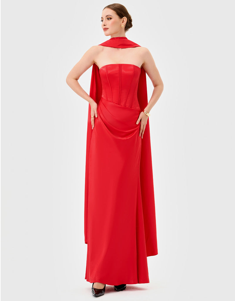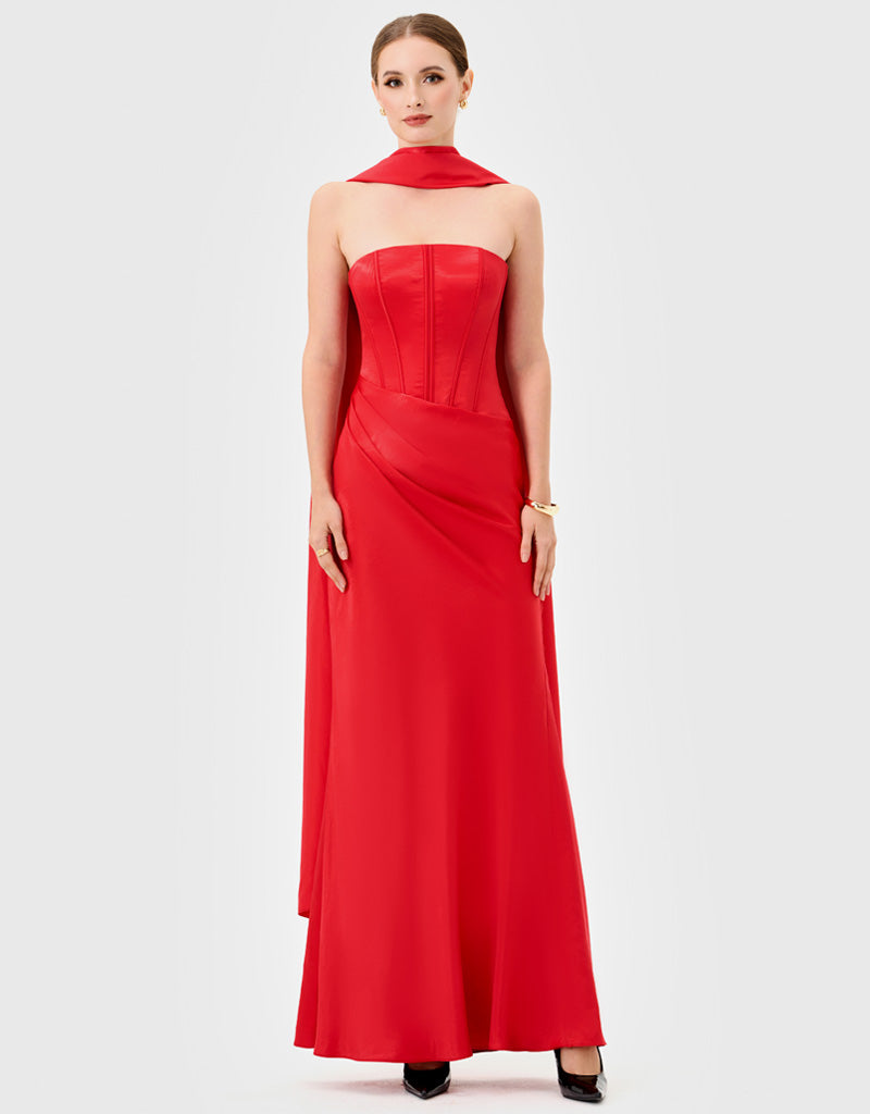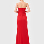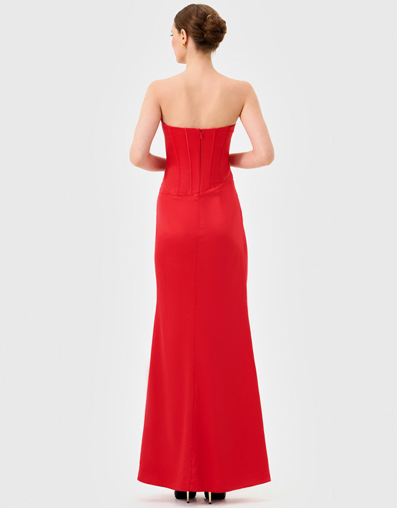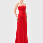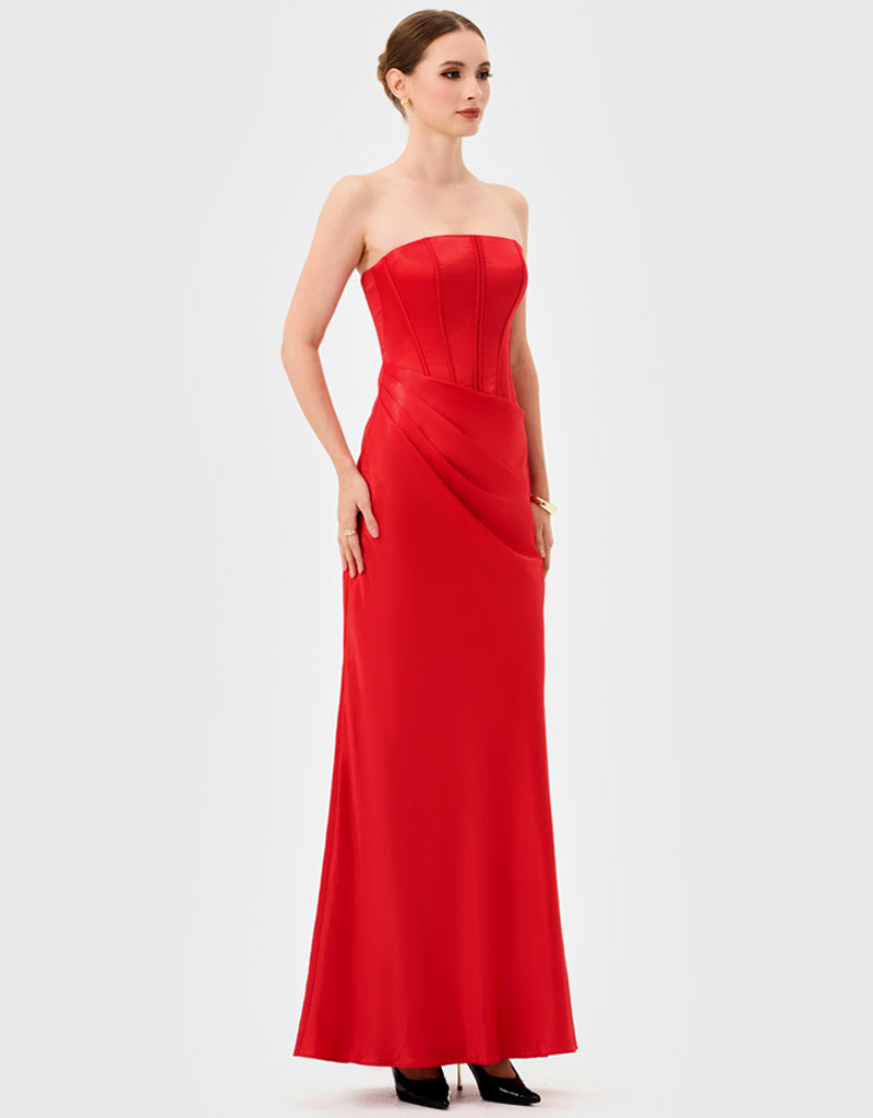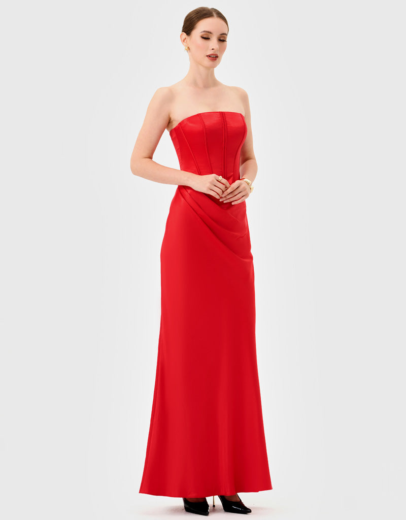 This strapless gown is cut with a gently curved neckline and structured with built-in cups for support. The corset-style bodice features paneled seams and boning, creating a defined silhouette that transitions into a floor-length skirt with soft draping at the hips. Fully lined and finished with an invisible back zip for a seamless close.