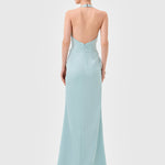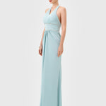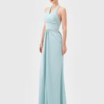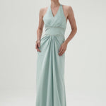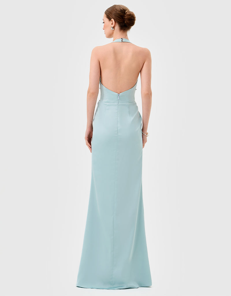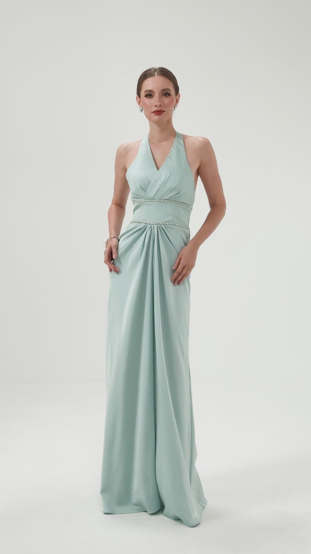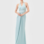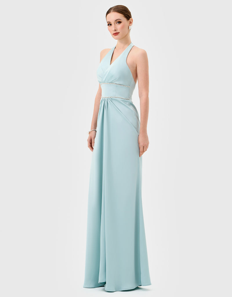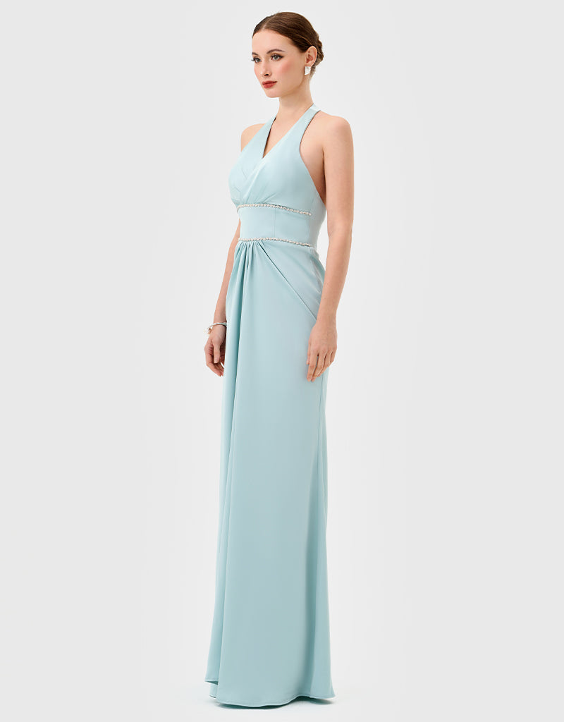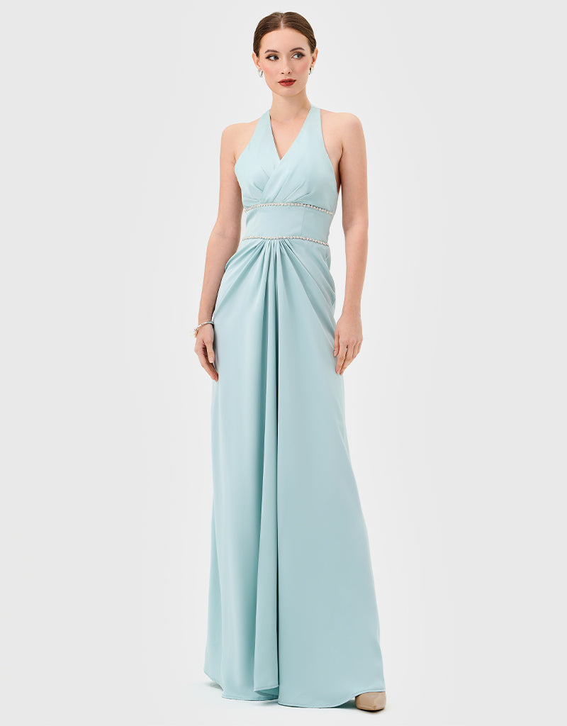 This halter gown features a crossover V neckline and low back, with a softly gathered bodice accented by an embellished waistband, flowing into a full-length skirt with a graceful front drape and invisible zip closure.