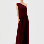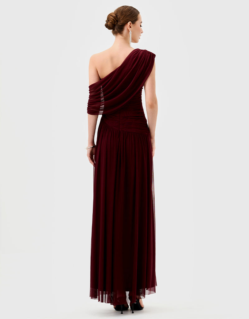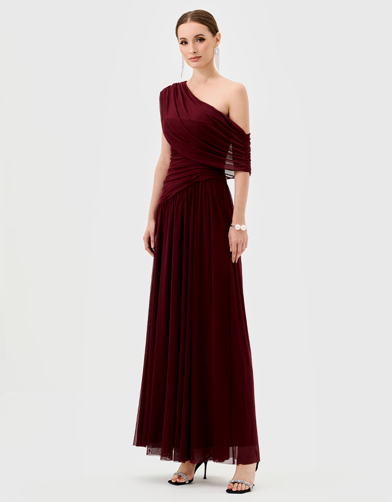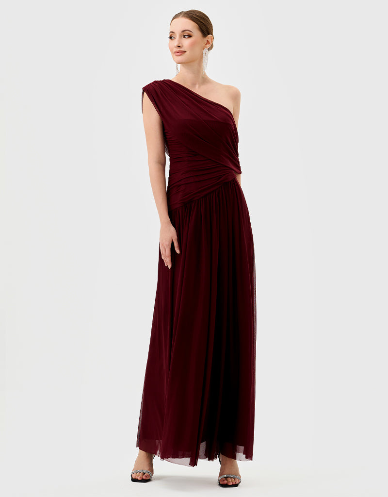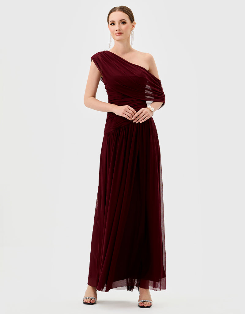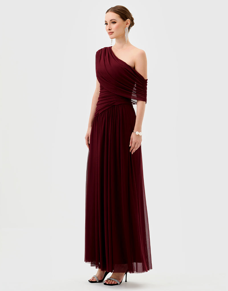 One-shoulder neckline with ruched draping across bodice